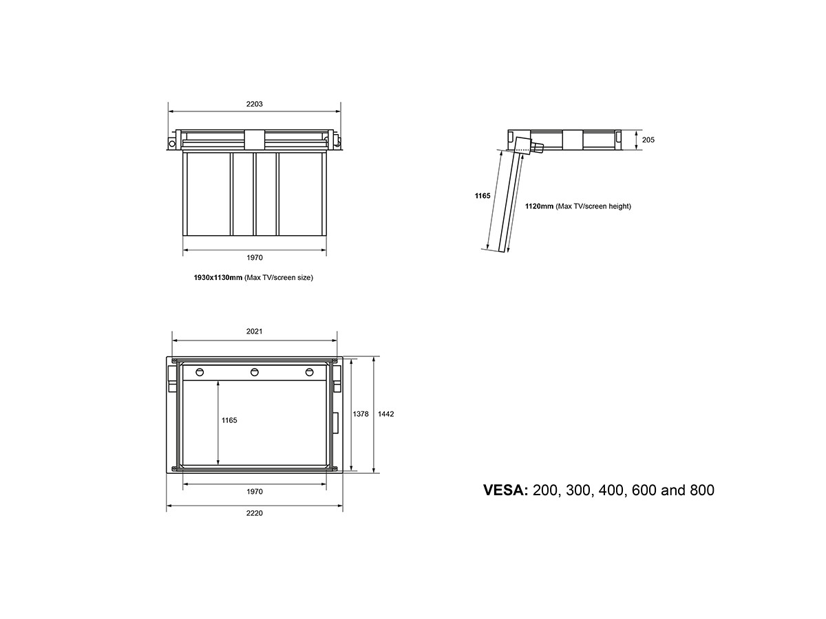 | VESA standard: | 200x200, 300x300, 400x400, 600x600, 800x800mm |