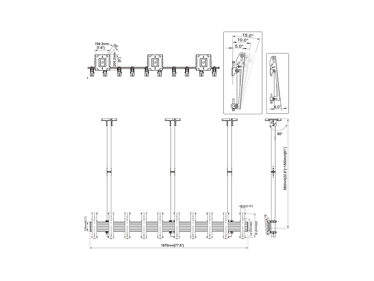 | Pillar length: | Min: 580mm to Max: 1550 mm from ceiling to VESA plate center |