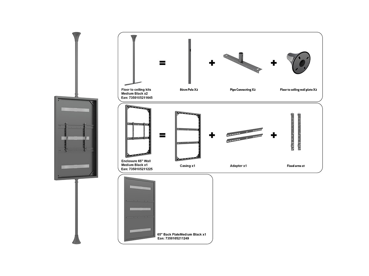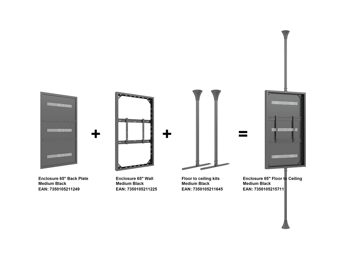 Product code:M Pro Series Enclosure 65" Floor to Ceiling Medium Black – Floor to ceiling mount with casing for display, steel, 3m length, 1 screen, single side, fixed arms, VESA max 600x400 - screen size: 65" - black