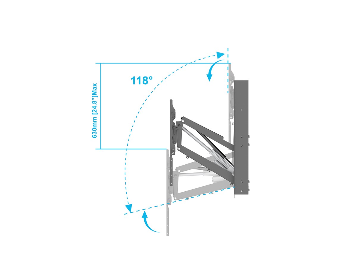 With this mount your TV can be lowered 630mm in position from its highest position to its lowest position. So you can already now try that at home, showing where your TV would be when using the M Motorized Pull Down Full Motion Flexarm 42"-86".