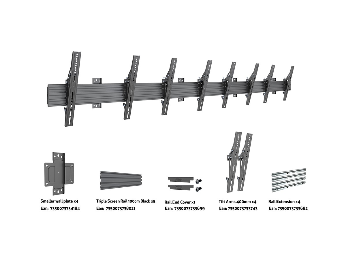 Product code:M Wallmount Pro MBW4U Tilt Black - Wall mount for LCD display, steel, 4 screen, single side, tilt, VESA Max 400x400 - Maxload 30kg - screen size: 40"-65" - black