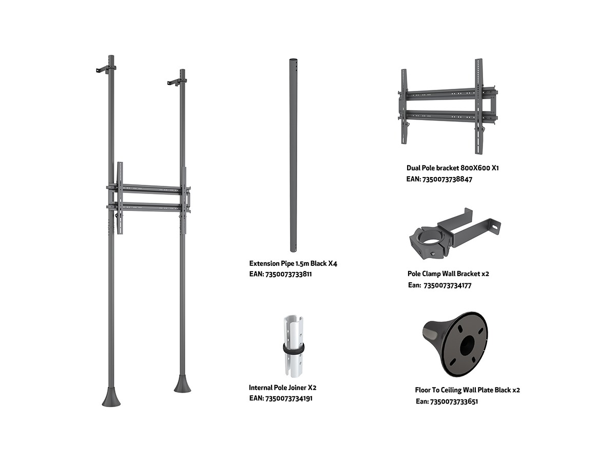 Product code:M Floor to Wall Mount Pro MBFW2P1UHD - Ceiling mount for LCD display, steel; 3m length, dual pole, 1 screen, single side, fixed arms, VESA max 800x600 - screen size: 65"-100" - Maxload: 125 kg - black
