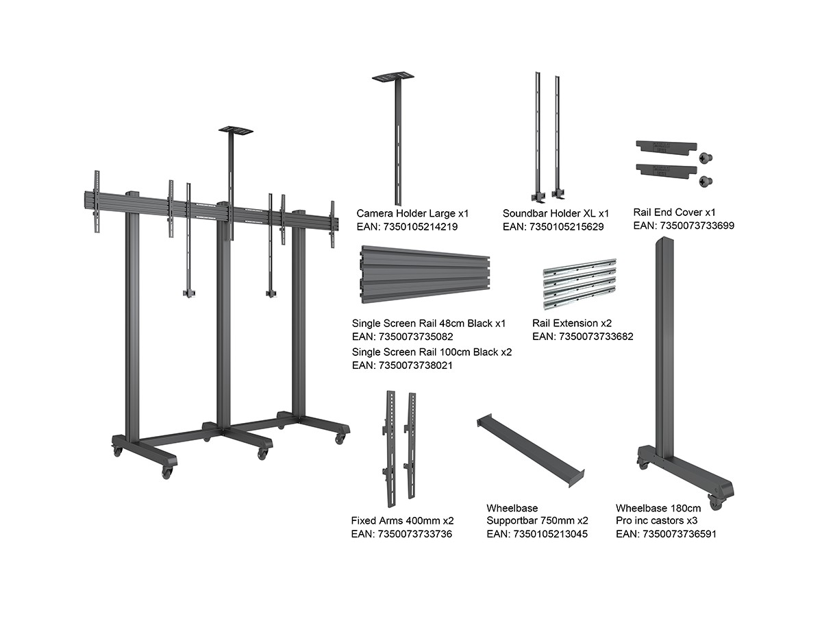 Product code:M Pro Series - Collaboration Floorstand Side by Side 75" - Included brackets 2x75" - Includes camera and soundbar/videobar brackets - Floorstand for dual displays, steel, 2 screen, single side, fixed, VESA Max 600x400 - screen size: 32"-75" - black