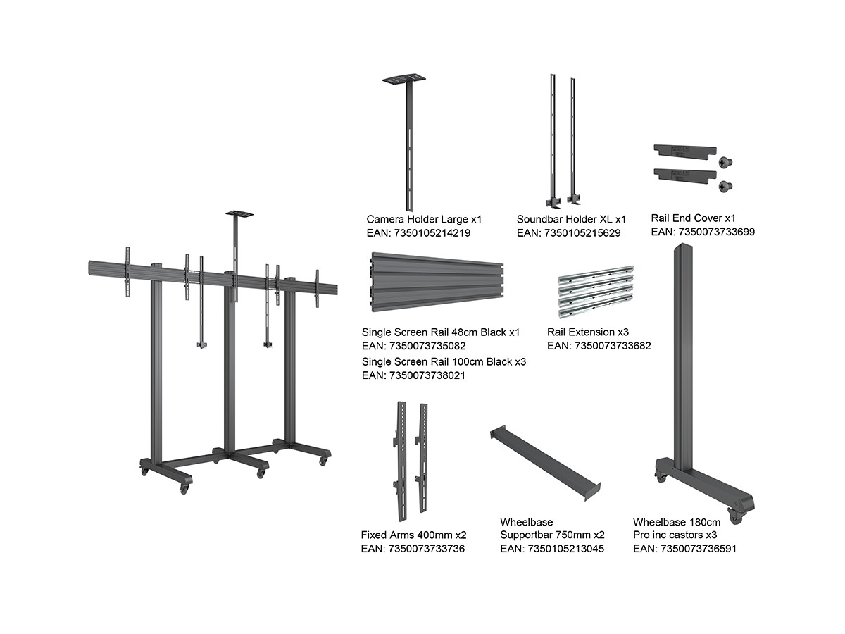 Product code:M Pro Series - Collaboration Floorstand Side by Side 90" - Included brackets 2x90" - Includes camera and soundbar/videobar brackets - Floorstand for dual displays, steel, 2 screen, single side, fixed, VESA Max 800x400 - screen size: 75"-90" - black