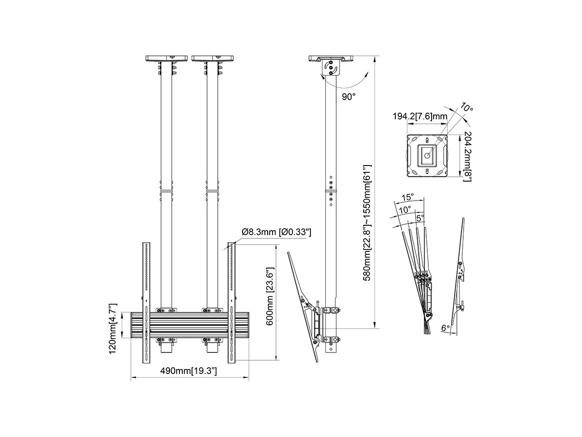 | Pillar length: | Min: 580mm to Max: 1550 mm from ceiling to VESA plate center Extension pipes: 1.5m (800mm*4pcs) included |