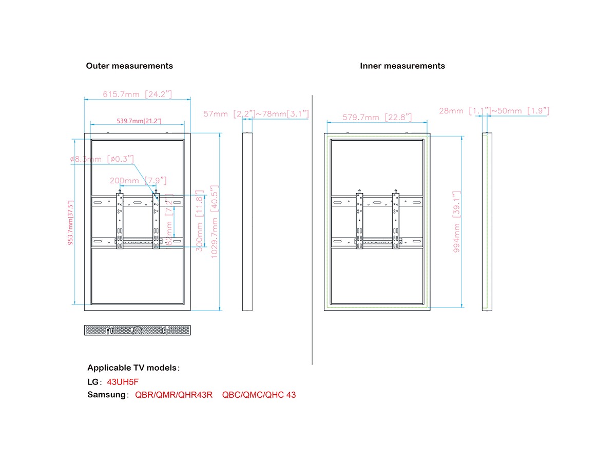 | Installation: | Samsung 43" QBR/QMR/QHR43R LH43QHBEBGCXEN LG 43" 43UH5F / LG 43UH5J / 43UM5N-H Ilyama LH4354UHS-B1AG Philips 43" 43BDL3550Q/43BDL3510Q/ 43BDL35511Q/ 43BDL4510D/43BDL4550D and other 43" Q/ SHARP/NEC ME431 SONY 43" FW-43BZ30J BenQ ST4302S + other 43" displays not model specified here (check measurements). |