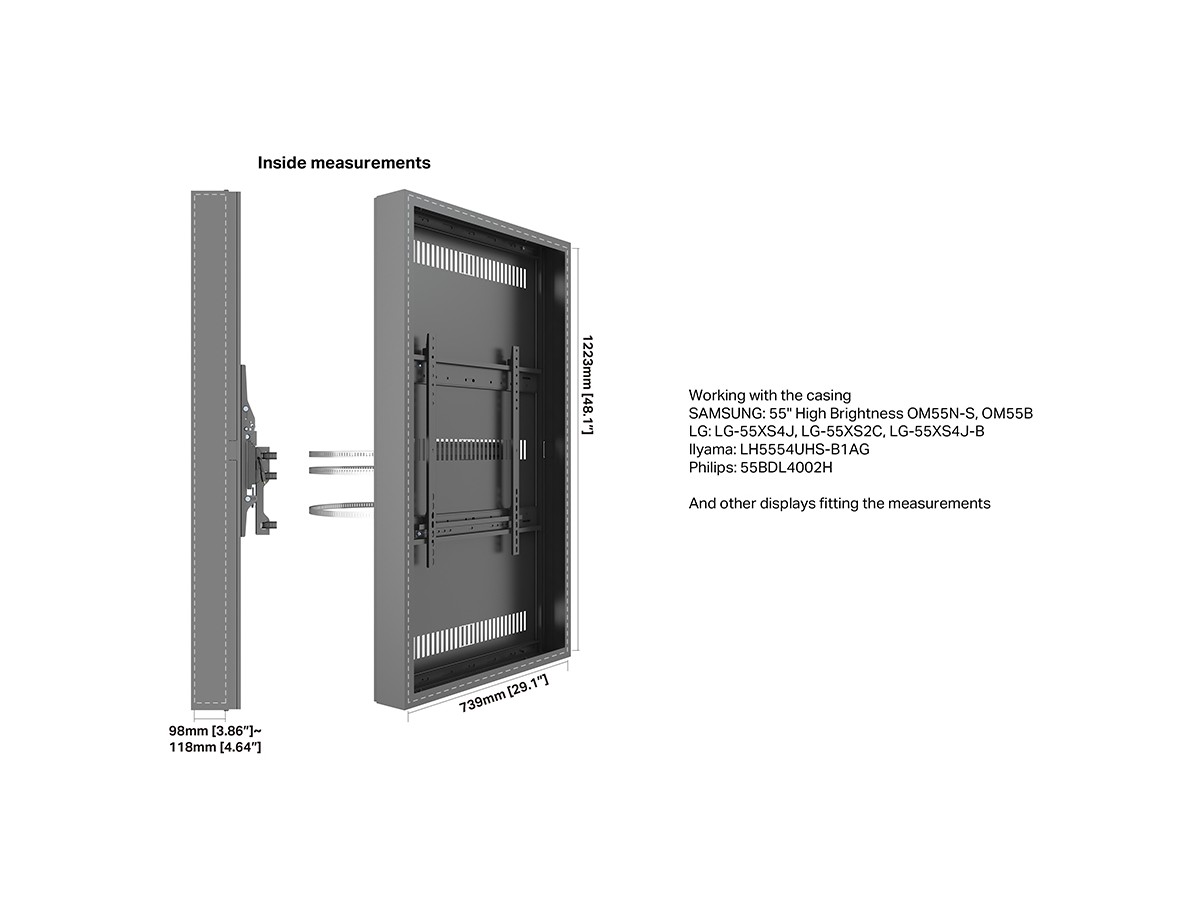 | Installation: | SAMSUNG 55" High Brightness OM55N-S, OM55B LG-55XS4J, LG-55XS2C, LG-55XS4J-B Ilyama LH5554UHS-B1AG Philips-55BDL4002H + other 55" displays not model specified here (check measurements). |