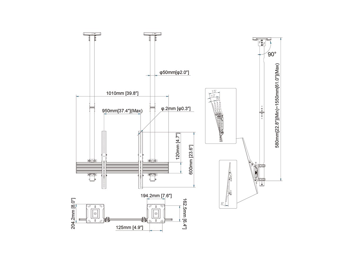 | Pillar length: | Min: 580mm to Max: 1550 mm from ceiling to VESA plate center Extension pipes: 1.5m (800mm*4pcs) included |