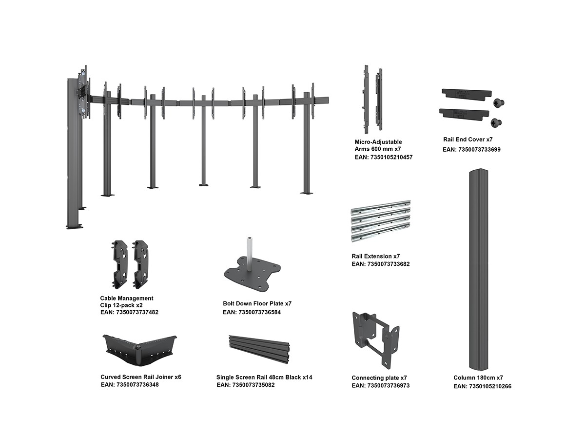Product code:M Pro Series – Video Wall Floormount MBFMC7x1U VESA 600 - Floor column mount for seven displays, steel, 7 screens, single side, micro adjustable arms, VESA Max 400x600 - black
