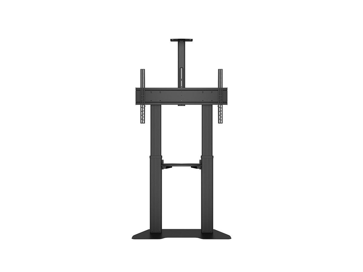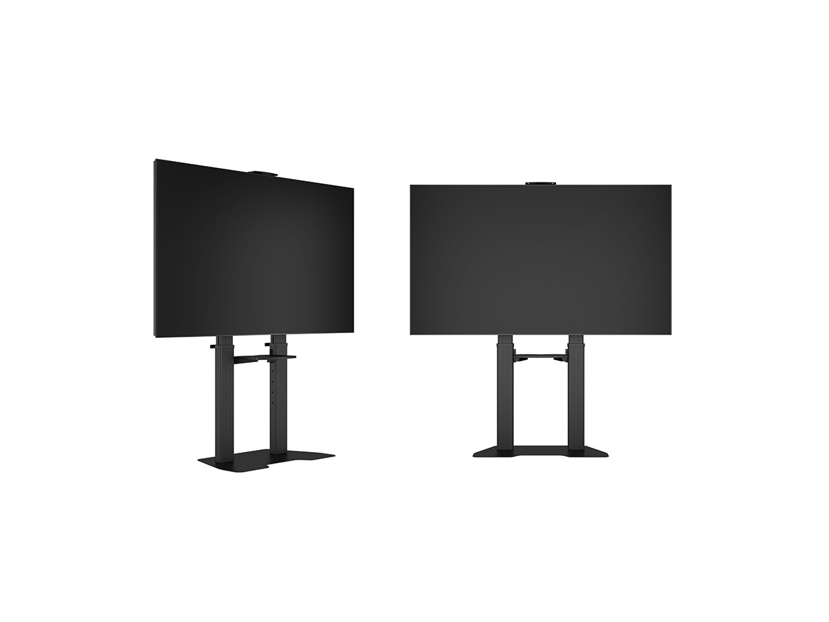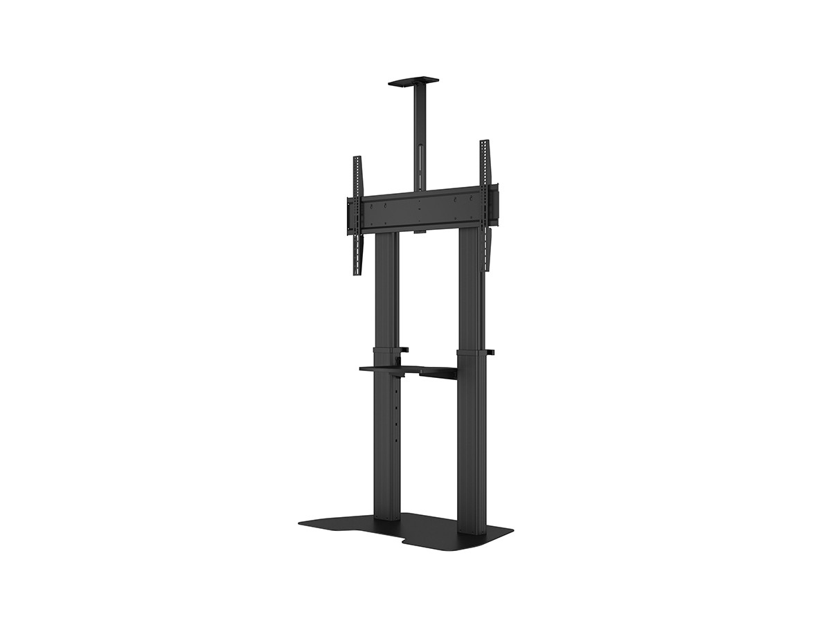 Now you can mount flat panel screens up to 100" displays on a movable Floorstand. With its black, textured powder coat finish it helps hide finger prints or dust. This Floorstand features an easy to position display height adjustment function that is unique. This innovative design with a built in stopper mechanism into the two columns creates a tool free and effortless TV height adjustment. This function reduces time consuming adjustments of height that is used on other floorstands. Now you in seconds can match your audience wheter its sitting or standing up. For fast installation the base comes pre-assembled. VESA specifications ranges from 200x200 up to 1000x600 VESA display mounting pattern, and sturdy swivel casters – two of which are lockable to keep the Floorstand in it´s place. The integrated cable management system that helps keep your cables organized and out of the way. During its introduction this versatile Floorstand also comes with accessories such as the component shelf and camerashelf included as standard.