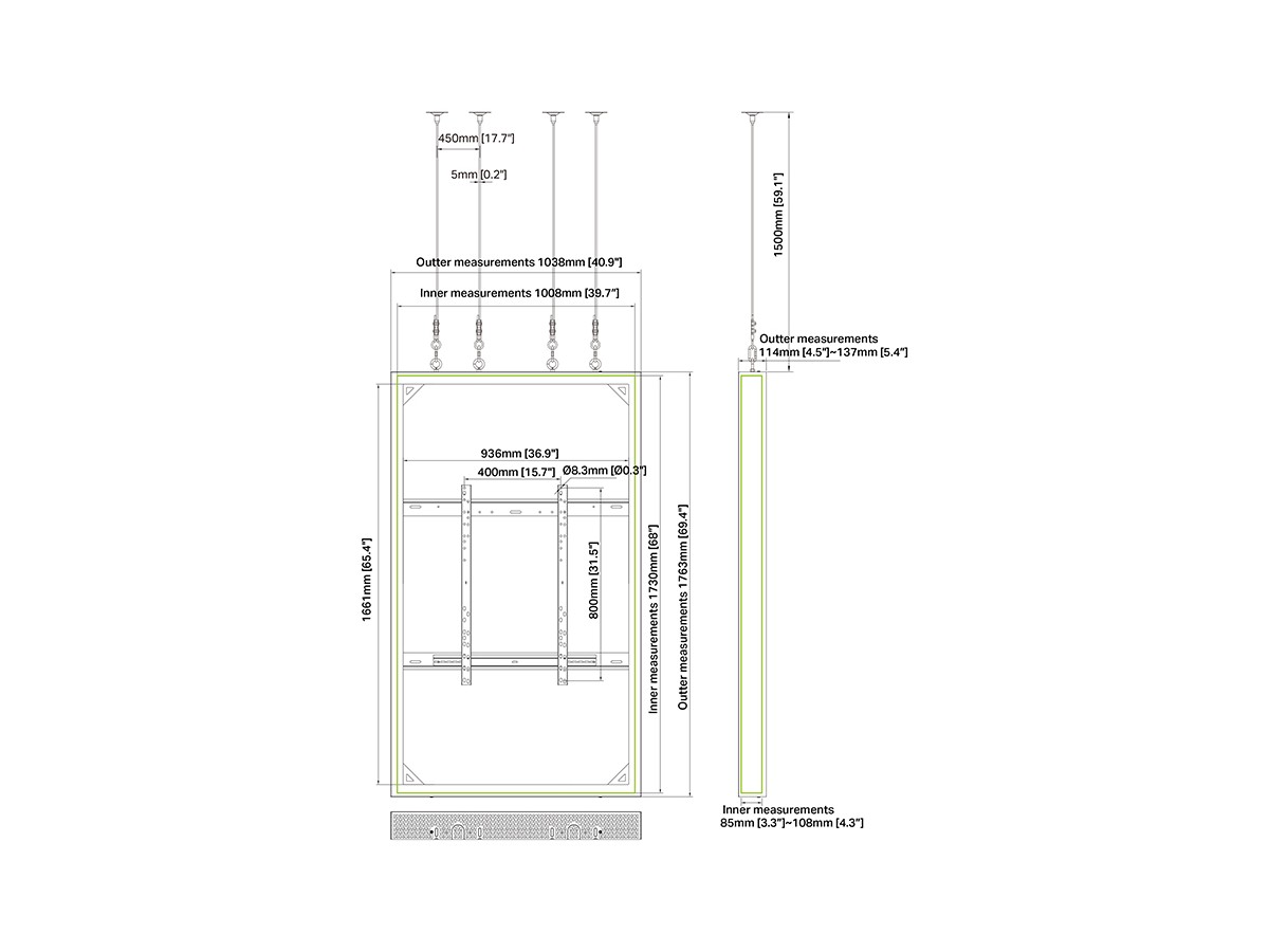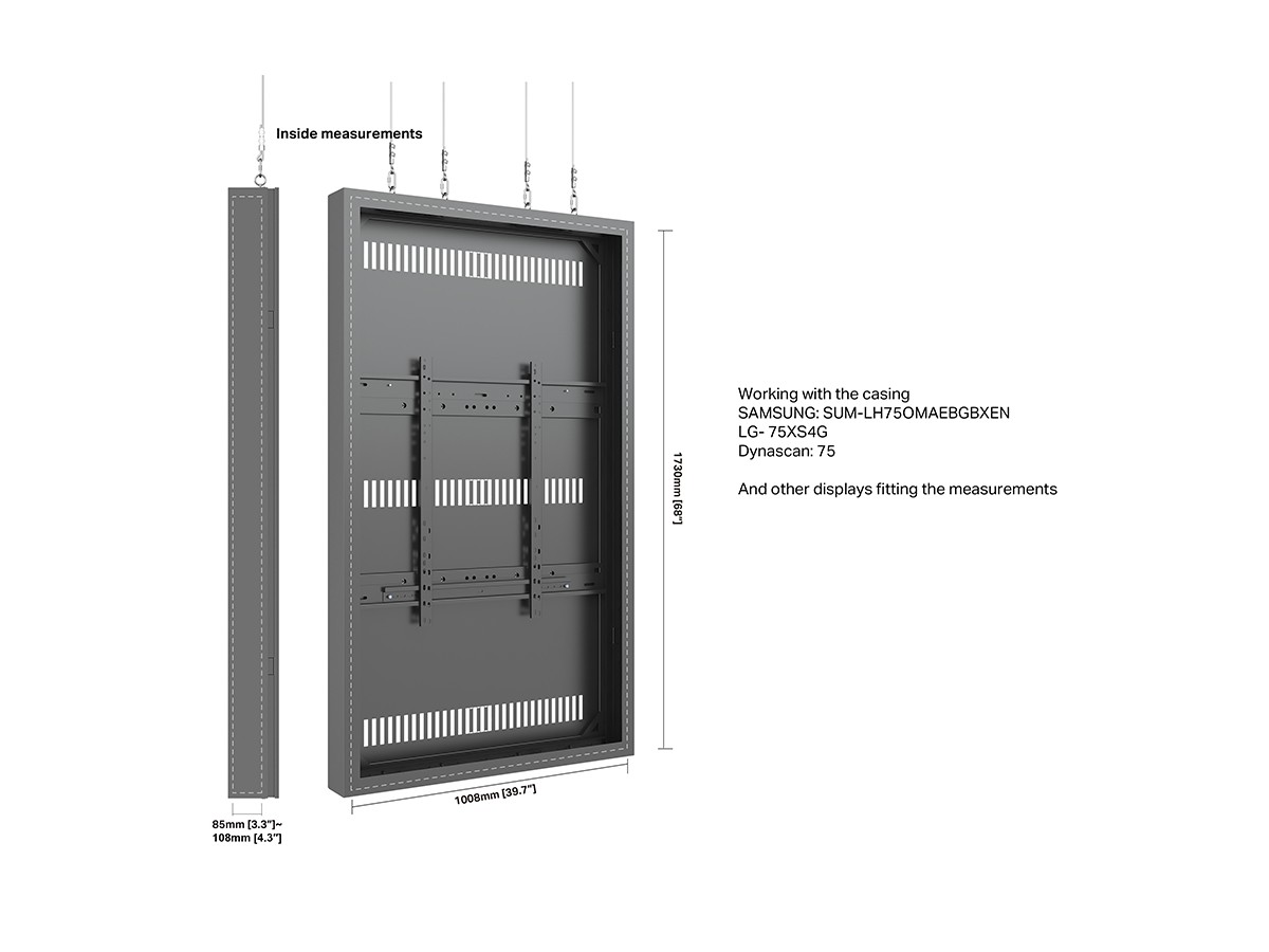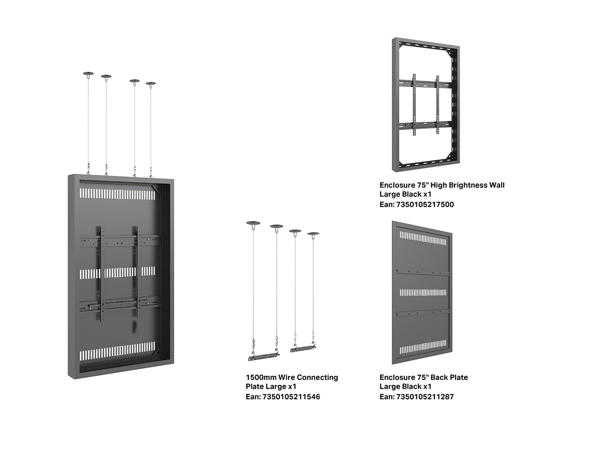The M Pro Series Enclosure 75" High Brightness Wire Large Black. A well-designed casing /enclosure with hanging wires. Creating a minimalistic look and possible to mount in both Portrait or Landscape position this casing from Multibrackets® is one of the most versatile to date. The casing includes after adjustment possibilities and can be used for most brands of signage displays on the market. With a smart thermal management, this solution can fit more brands as well as creating thermal management second to none. Wire diameter 5mm.