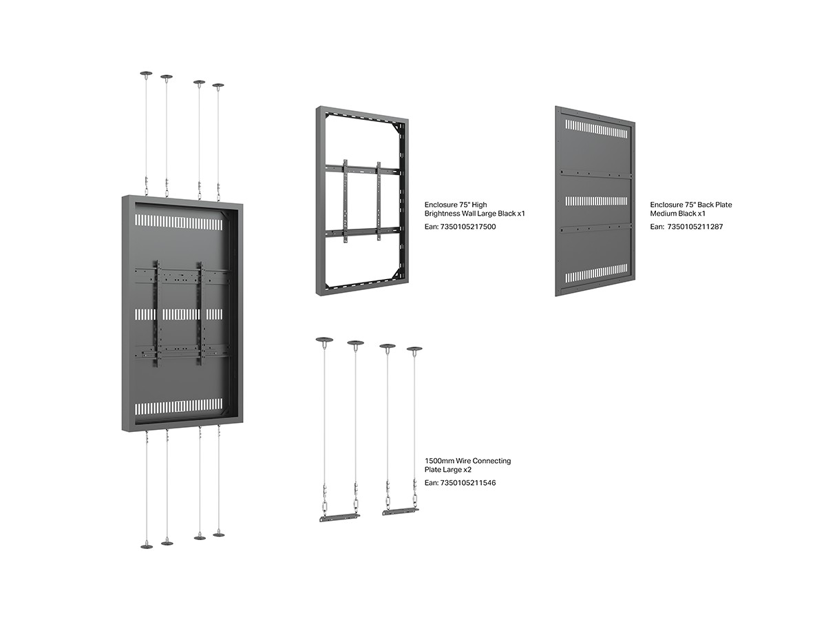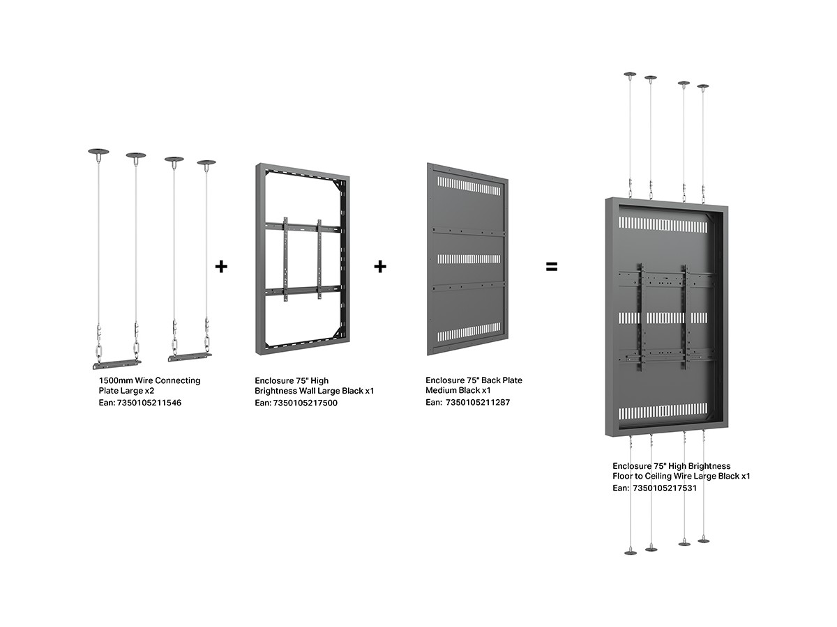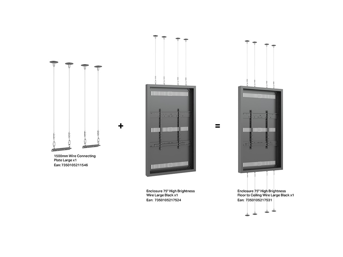 The M Pro Series Enclosure 75" High Brightness Floor to Ceiling Wire Large Black. A well-designed casing /enclosure with hanging wires. Creating a minimalistic look and possible to mount in both Portrait or Landscape position this casing from Multibrackets® is one of the most versatile to date. The casing includes after adjustment possibilities and can be used for most brands of signage displays on the market. With a smart thermal management, this solution can fit more brands as well as creating thermal management second to none. Wire diameter 5mm.