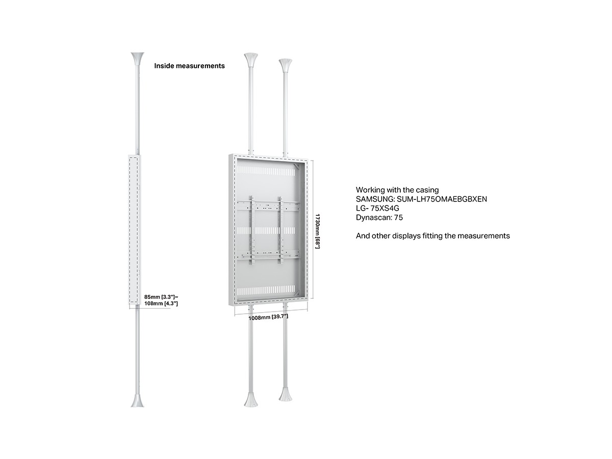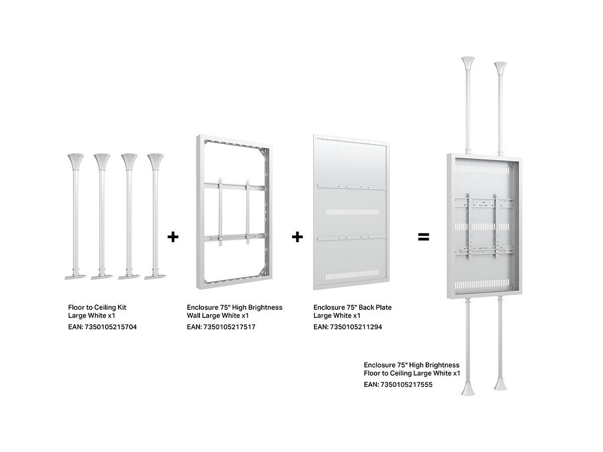 Product code:M Pro Series Enclosure 75" High Brightness Floor to Ceiling Large White - Floor to ceiling mount with casing for display, steel, 3m length, 1 screen, single side, fixed arms, VESA max 600x800 - screen size: 75" - white