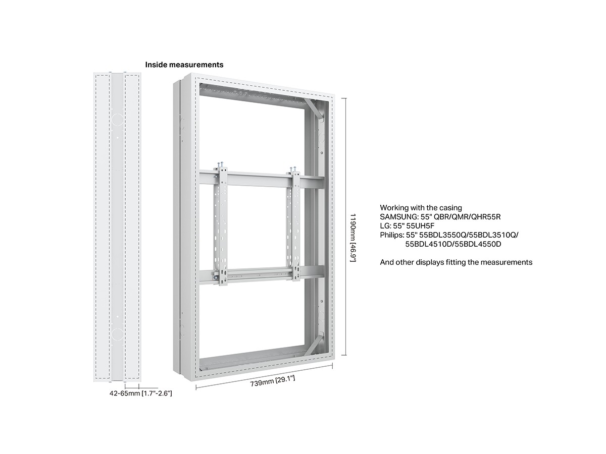 | Installation: | Samsung QBR/QMR/QHR55R/OM55B/OM55N-S QMB-T 55 (Tested and approved by Samsung) LG 55UH5F, 55UH7F, 55UL3J-E, 55TNF5J Philips 55BDL3550Q/55BDL3510Q/55BDL4510D/55BDL3511Q/ 55BDL4550D/55BDL4511D/ 55BDL4650D Sharp PNHW551 Sony FW-55BZ40L BenQ SL5502K/ ST5502S + other 55" displays not model specified here (check measurements). |
