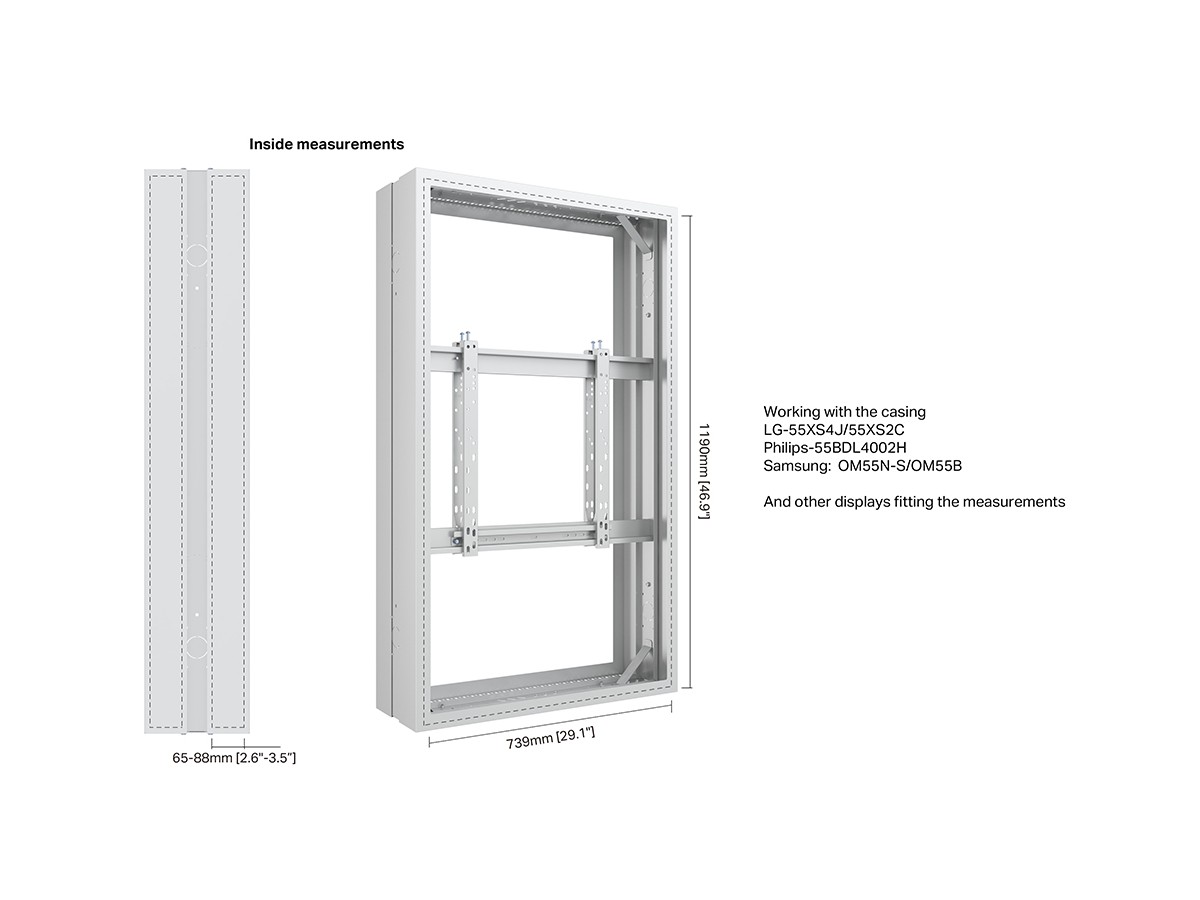 - A front frame that creates space for a high brightness 55” in the casing