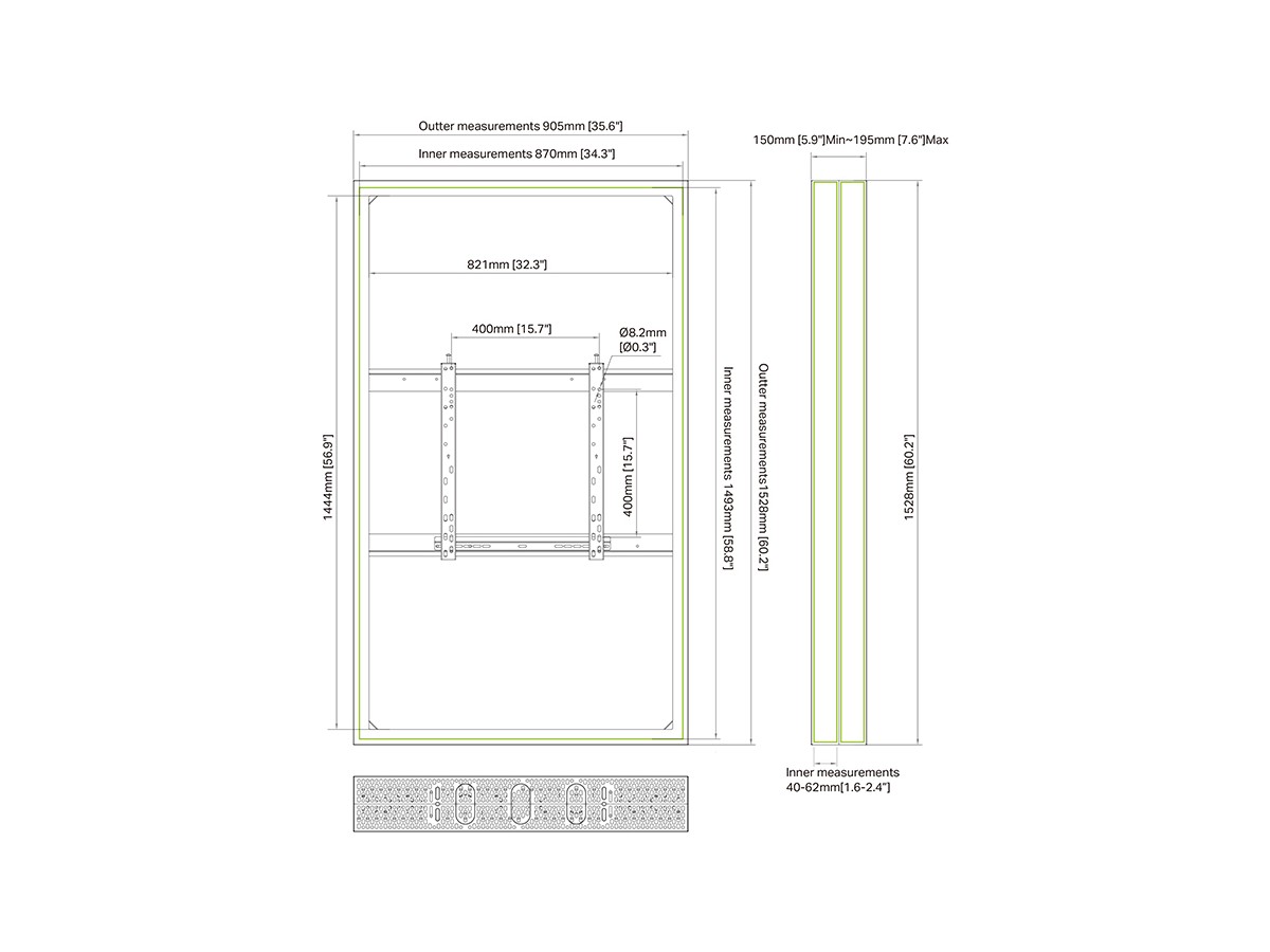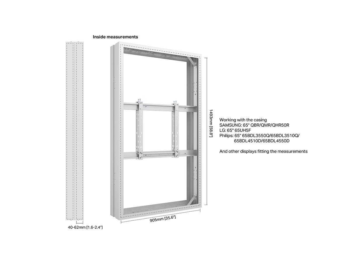 | Installation: | Samsung 65" QBR/QMR/QHR65R LG 65" 65UH5F Philips 65" 65BDL3550Q/65BDL3510Q/65BDL4510D/65BDL4550D Sony FW-65BZ40L BenQ 6502S + other 65" displays not model specified here (check measurements) |