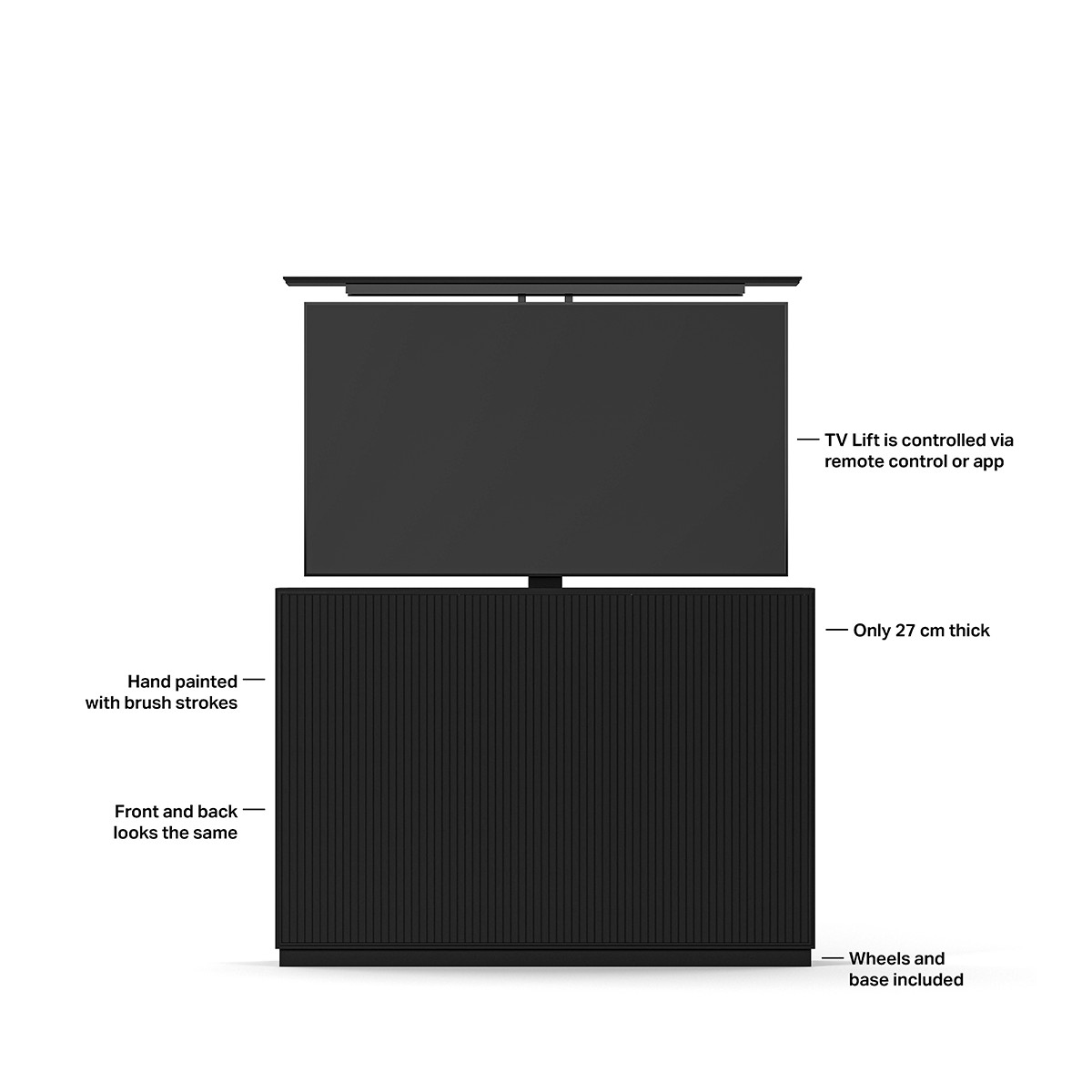 Product code:M AV Cabinet TV-Lift 55” Slimline Black - Cabinet for TV´s and displays - up to 55" - Pop up TV lift solution - remote control included - supports mobile phone app - VESA 200x200 - 600x400 - maxload 50kg - black