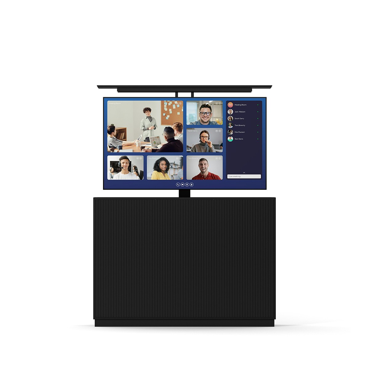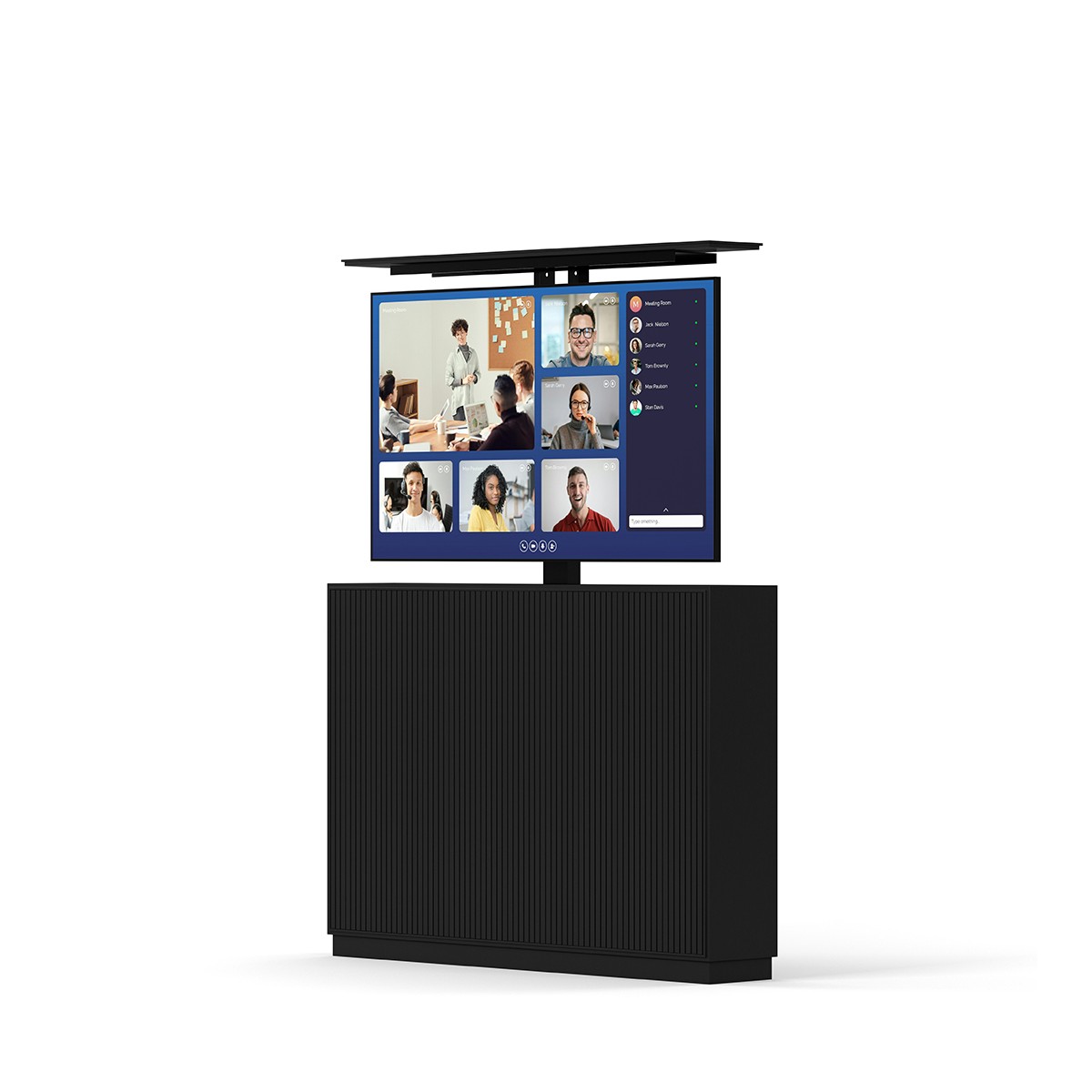 Combine this solution with a videobar and your computer to create a versatile meeting room station compatible with Teams, Skype, Zoom, and other video communication software. This complete pop-up TV lift solution is perfect for almost any situation, offering ease of use and significant cost savings by being functional in multiple locations. You'll always be ready to meet wherever you are within the building.