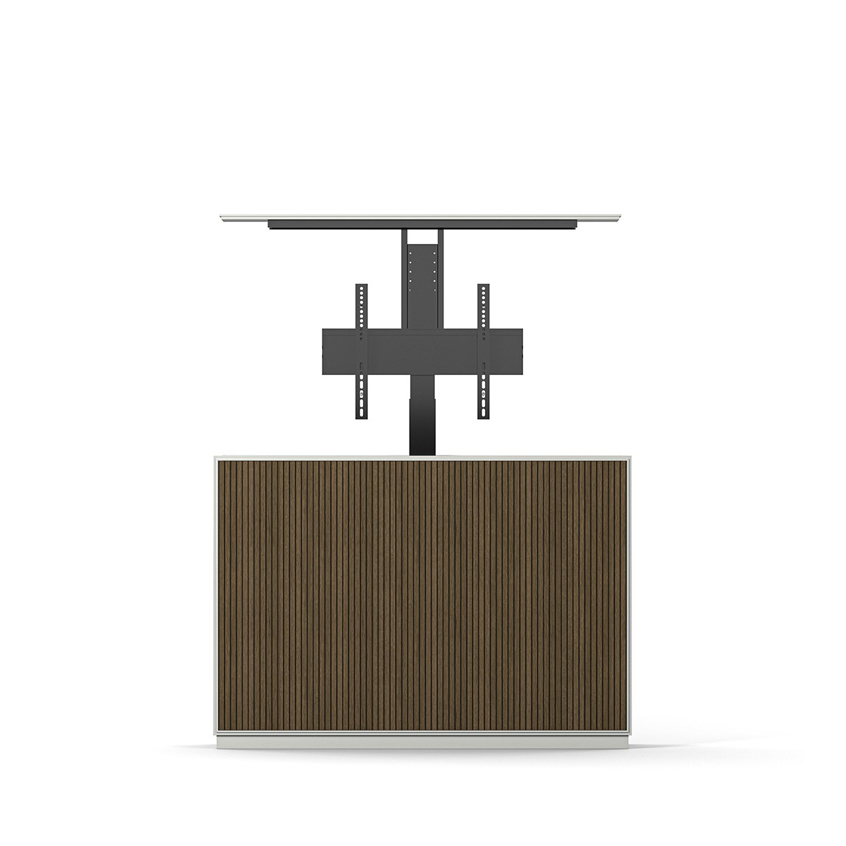 A smart space between the display and the cabinet is perfectly sized for a soundbar or videobar from major makers like Logitech, Poly, Cisco, and Bose, logically placed just under the display. This setup ensures excellent video and audio quality in both meeting rooms and living rooms. Additionally, tangled cords are a thing of the past. Like all our premium-quality TV Lift Cabinets, this cabinet stores and conceals all wires and cords, keeping them safely out of reach of children, pets, or anyone's feet.