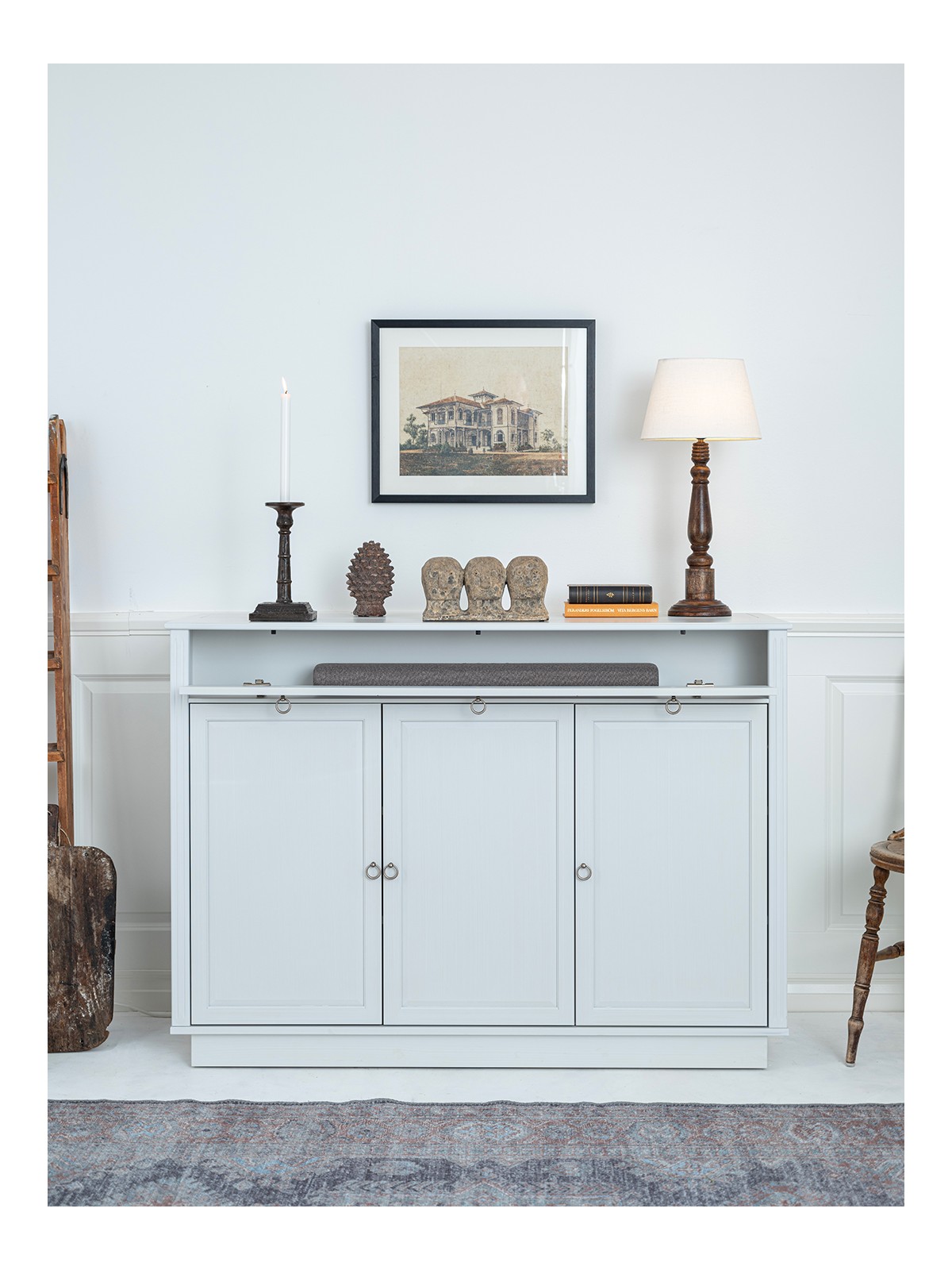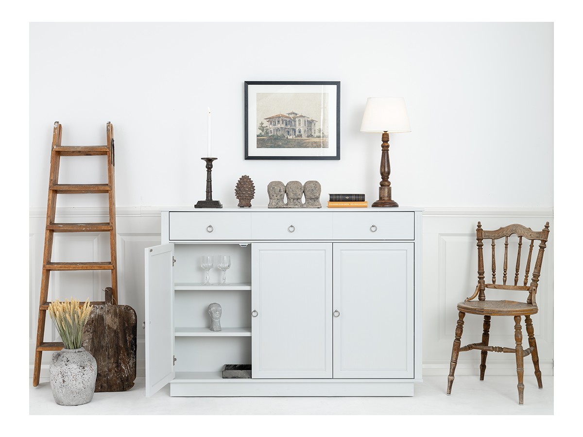 Classic, a timeless and elegant sideboard offered in the color Whitewash. All surfaces are hand painted, which creates a beautiful texture. The sideboard has a traditional design with fine details that give it a charming character. The three doors have beautiful cutouts and open up to two shelves, providing plenty of space to store things.