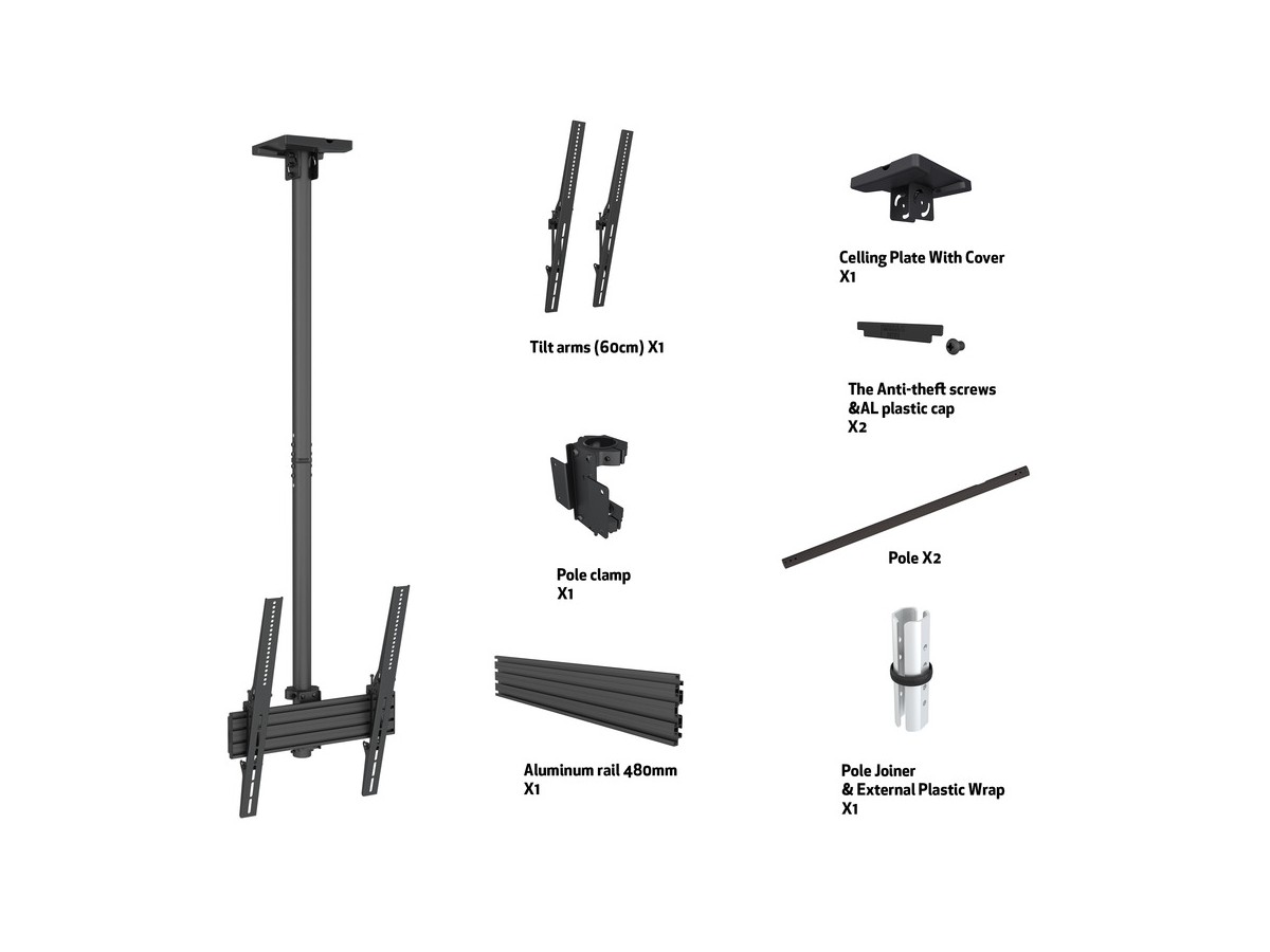 | Pillar length: | Min: 580mm to Max: 1550 mm from ceiling to VESA plate center Extension pipes: 1.5m (800mm*2pcs) included |
