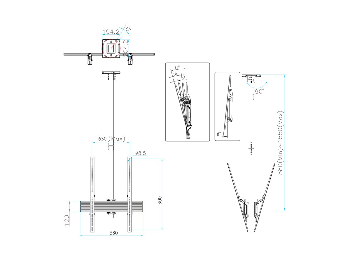 | Pillar length: | Min: 580mm to Max: 1550 mm from ceiling to VESA plate center Extension pipes: 1.5m (800mm*2pcs) included |