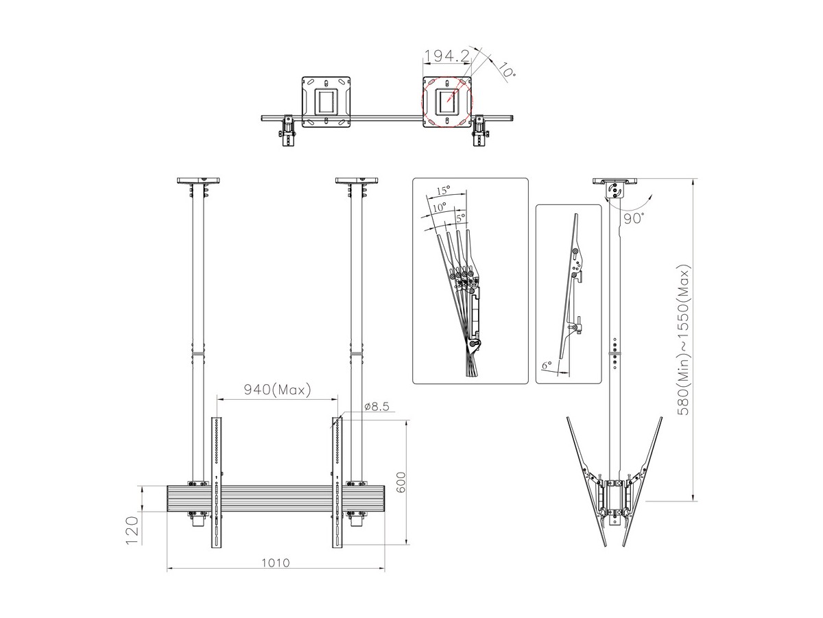 | Pillar length: | Min: 580mm to Max: 1550 mm from ceiling to VESA plate center Extension pipes: 1.5m (800mm*4pcs) included |