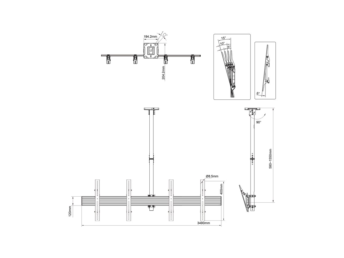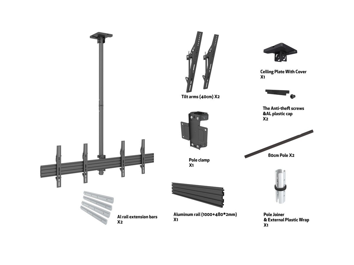 | Pillar length: | Min: 580mm to Max: 1550 mm from ceiling to VESA plate center Extension pipes: 1.5m (800mm*2pcs) included |