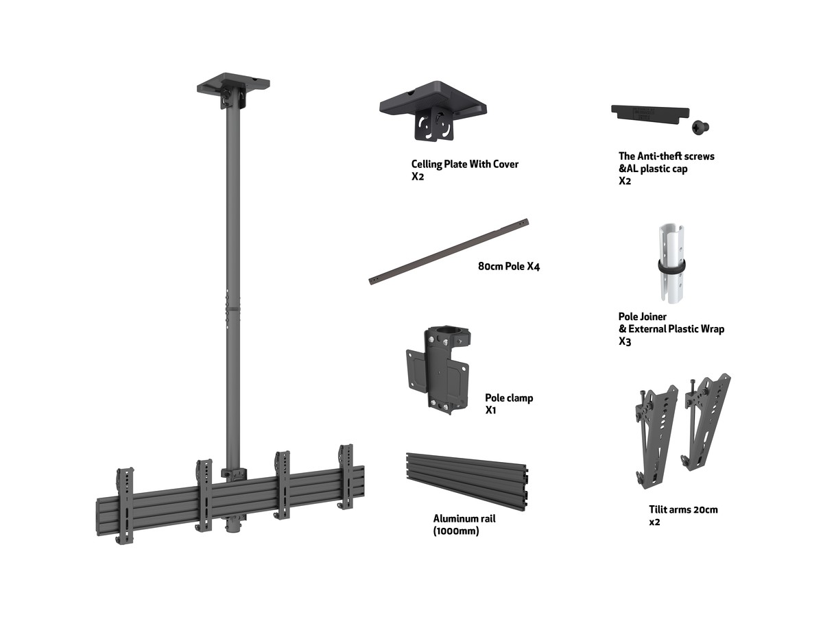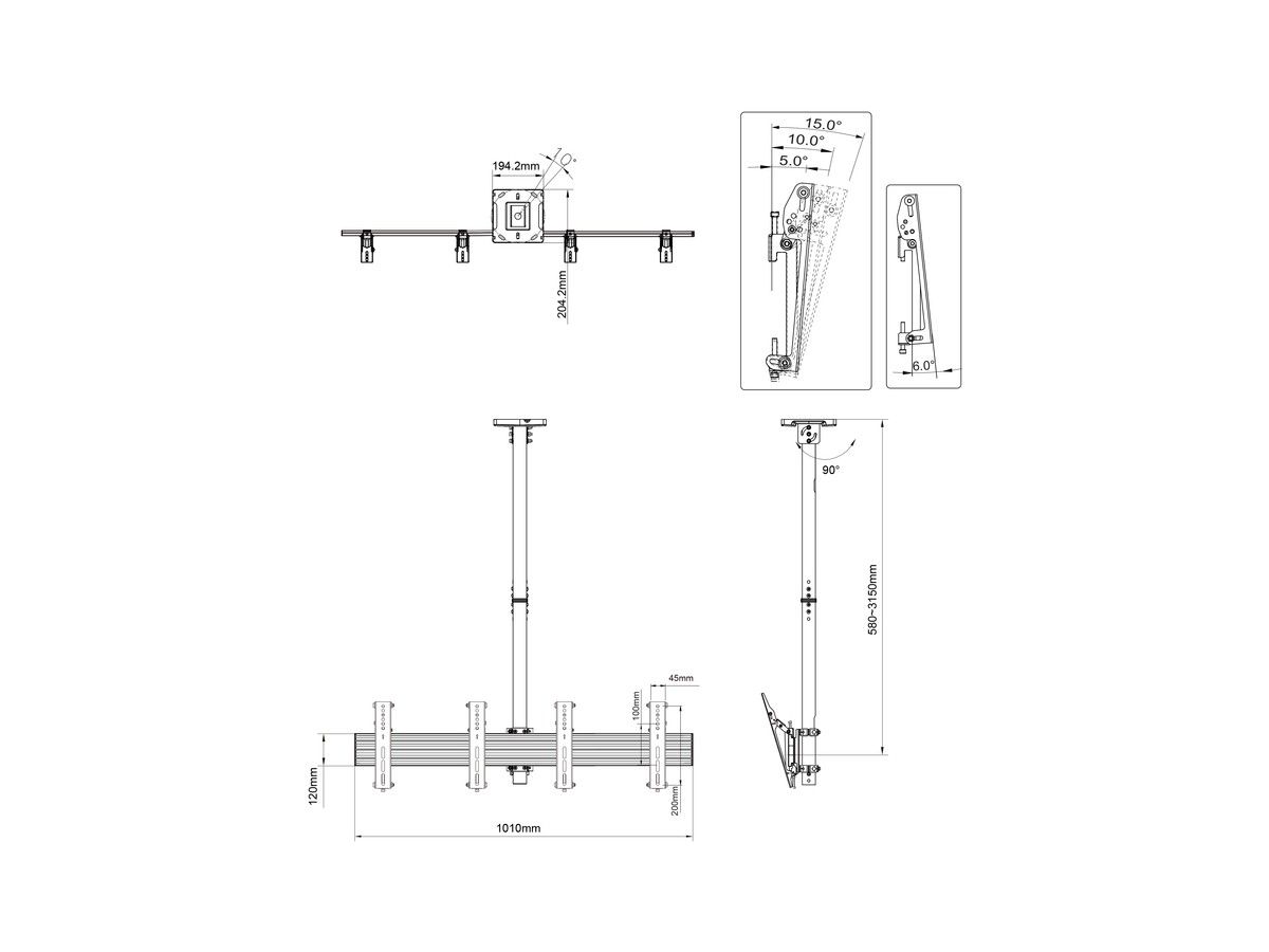 | Pillar length: | Min: 580mm to Max: 1550 mm from ceiling to VESA plate center Extension pipes: 1.5m (800mm*2pcs) included |