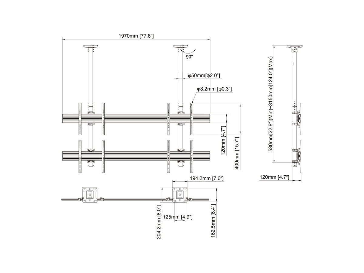 | Pillar length: | Min: 580mm to Max: 1550 mm from ceiling to VESA plate center Extension pipes: 3m (800mm*8pcs) included |