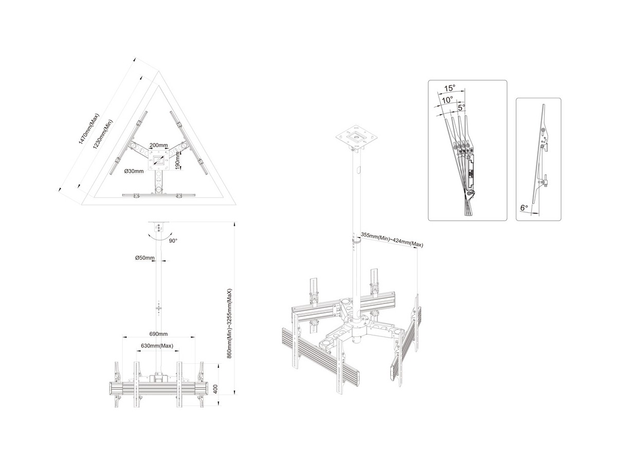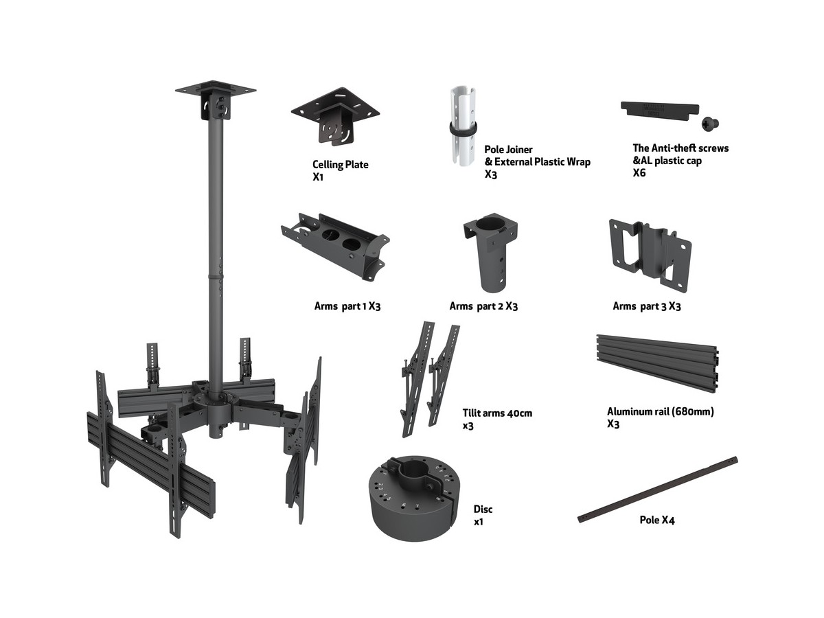 | Pillar length: | Min: 580mm to Max: 1550 mm from ceiling to VESA plate center Extension pipes: 3m (800mm*4pcs) included |