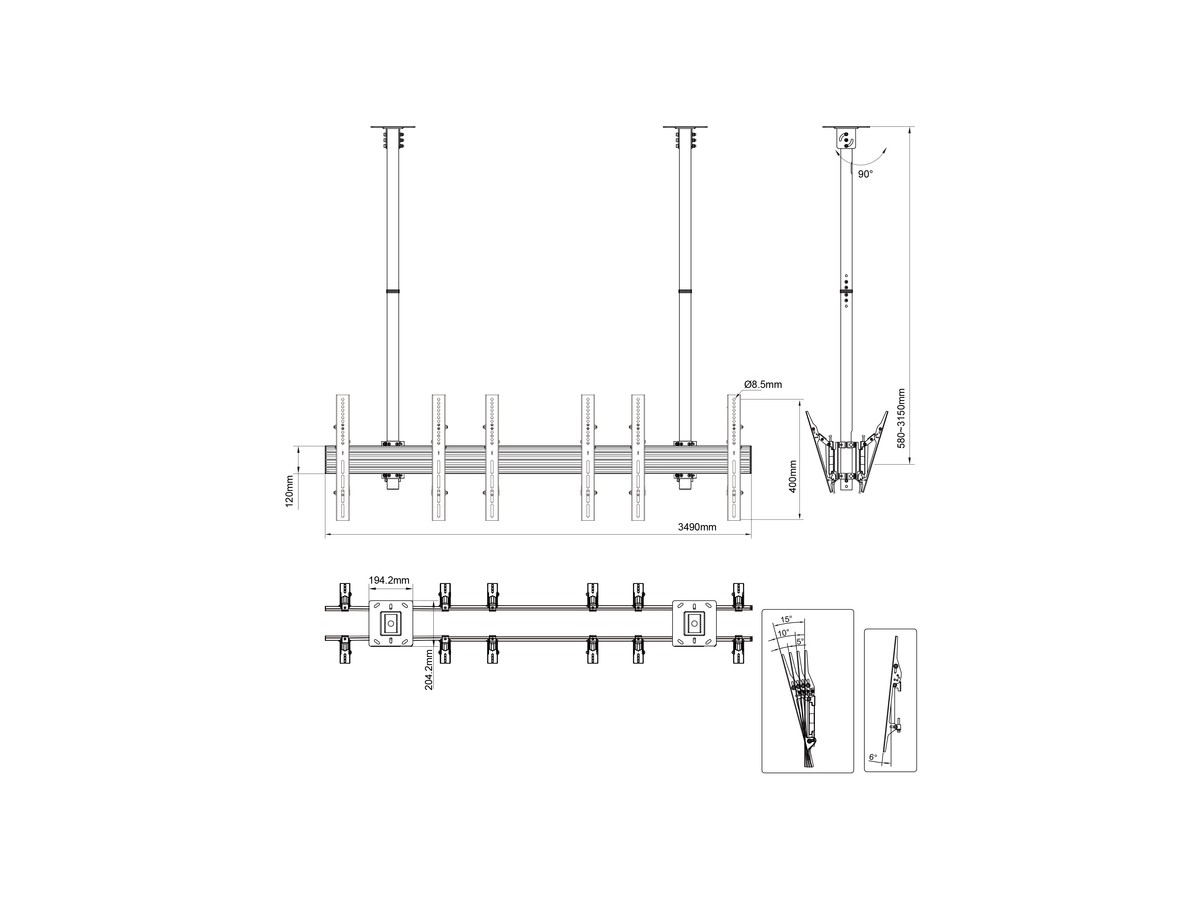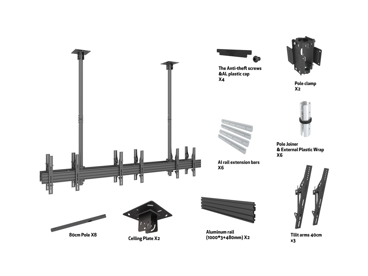 | Pillar length: | Min: 580mm to Max: 1550 mm from ceiling to VESA plate center Extension pipes: 3m (800mm*8pcs) included |