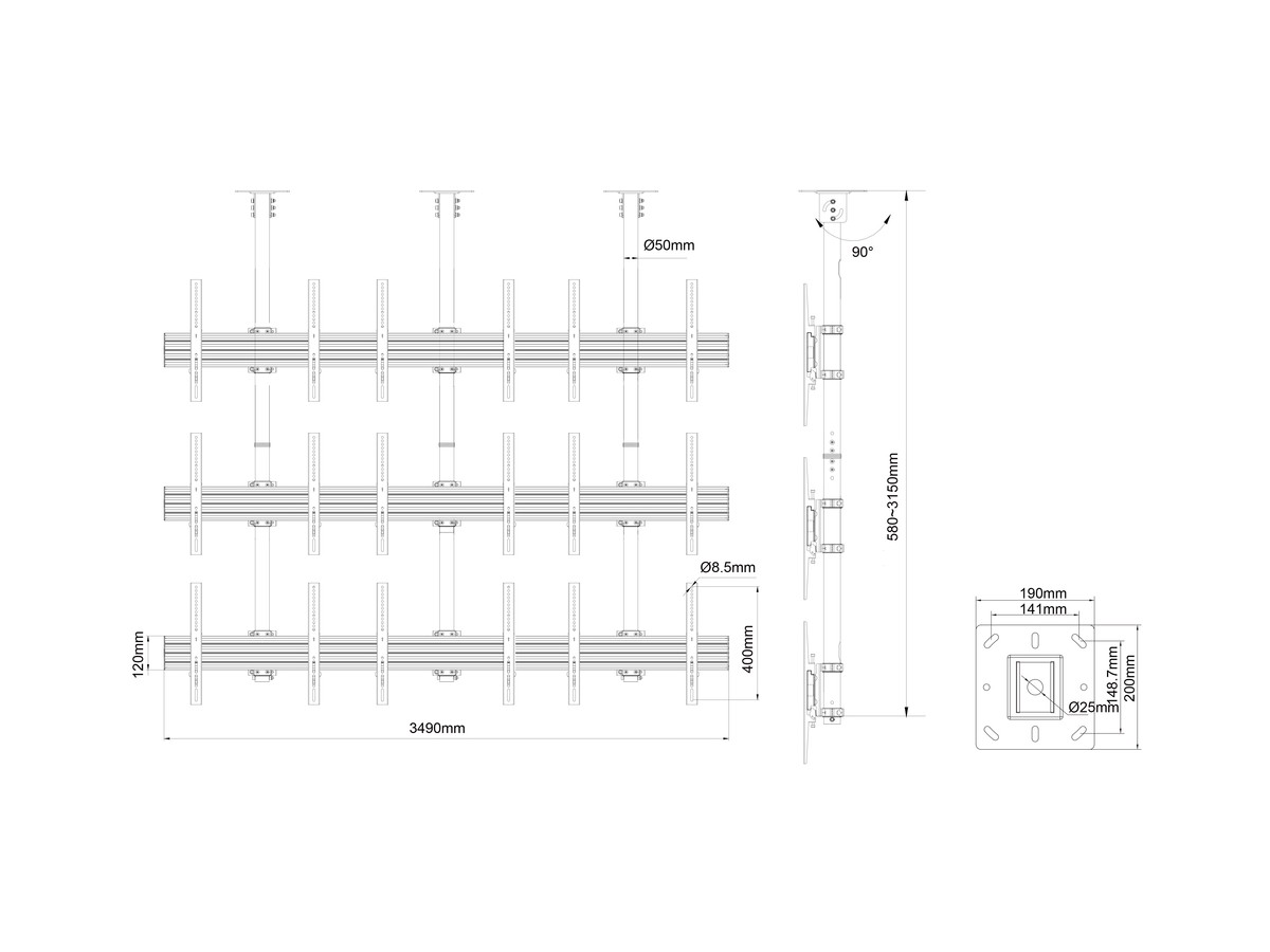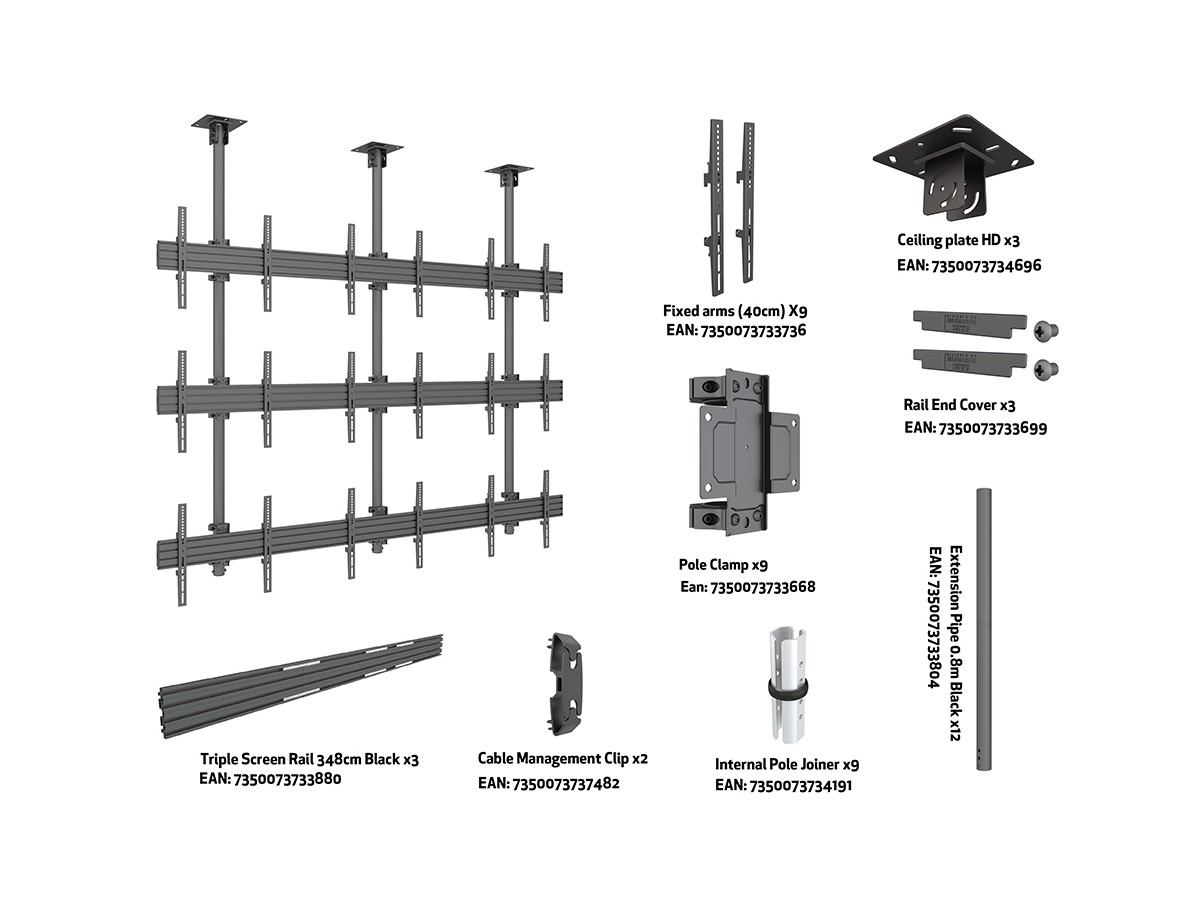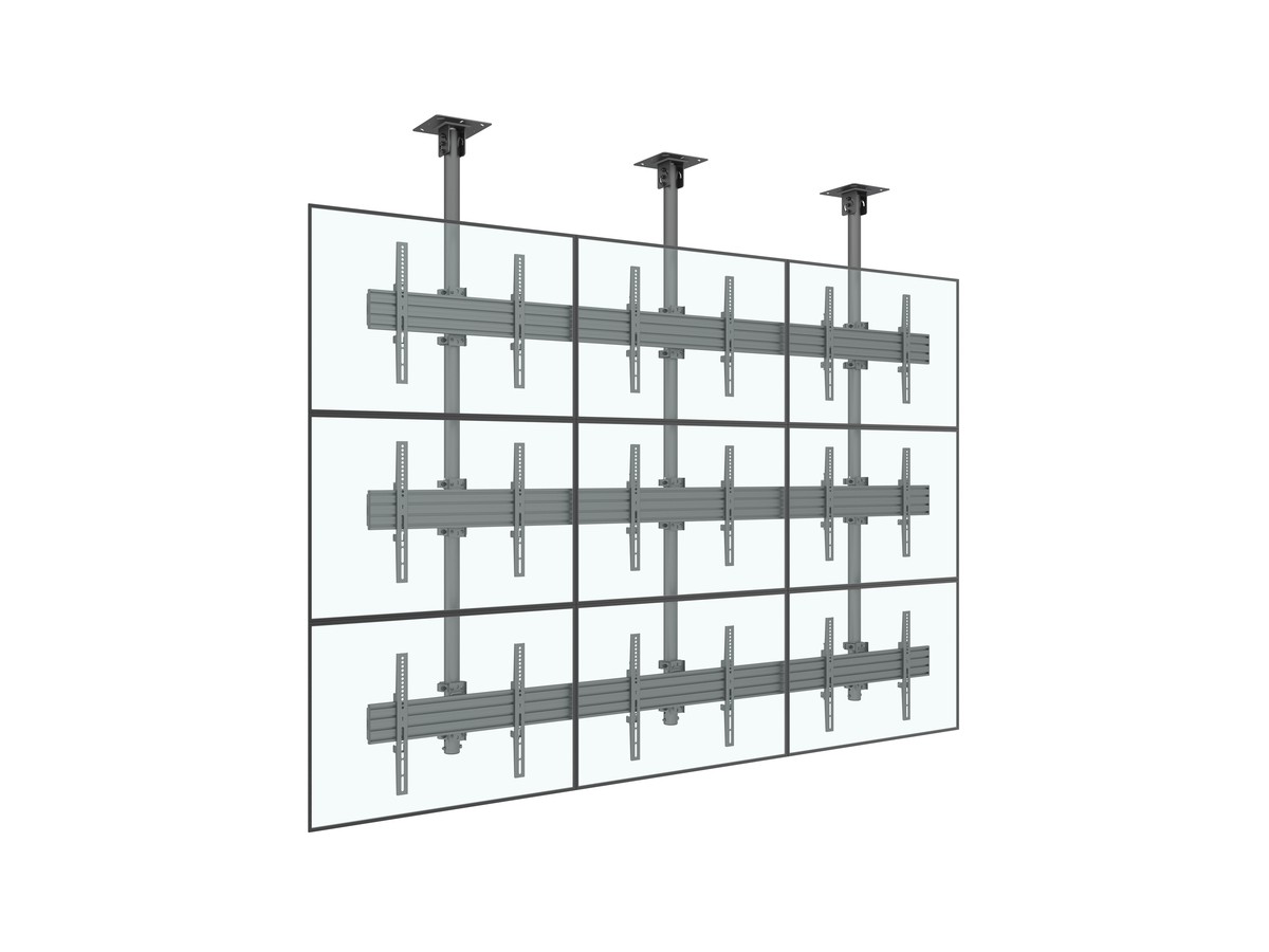 Product code:M Ceiling Mount Pro MBC3X3U - Ceiling mount for LCD display, steel, 3m length, TÜV, 9 screens, single side, fixed arms, VESA Max 600x400 - screen size: 40"-65" - black - TUV
