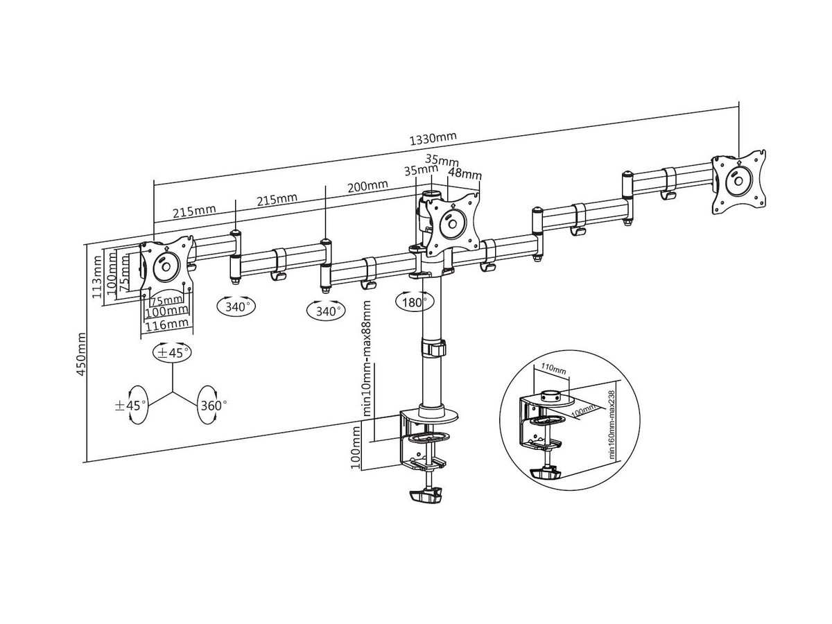 | Height: | 100 - 450mm Adjustable from table top to VESA plate center |