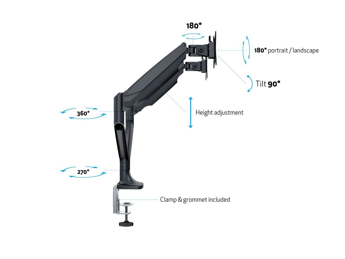 - The Dual arms easily adjust to support an ergonomically correct working position; sit more comfortably at your desk while reducing neck, eye and back strain, extend or retract monitor arm; rotate monitor to landscape or portrait mode