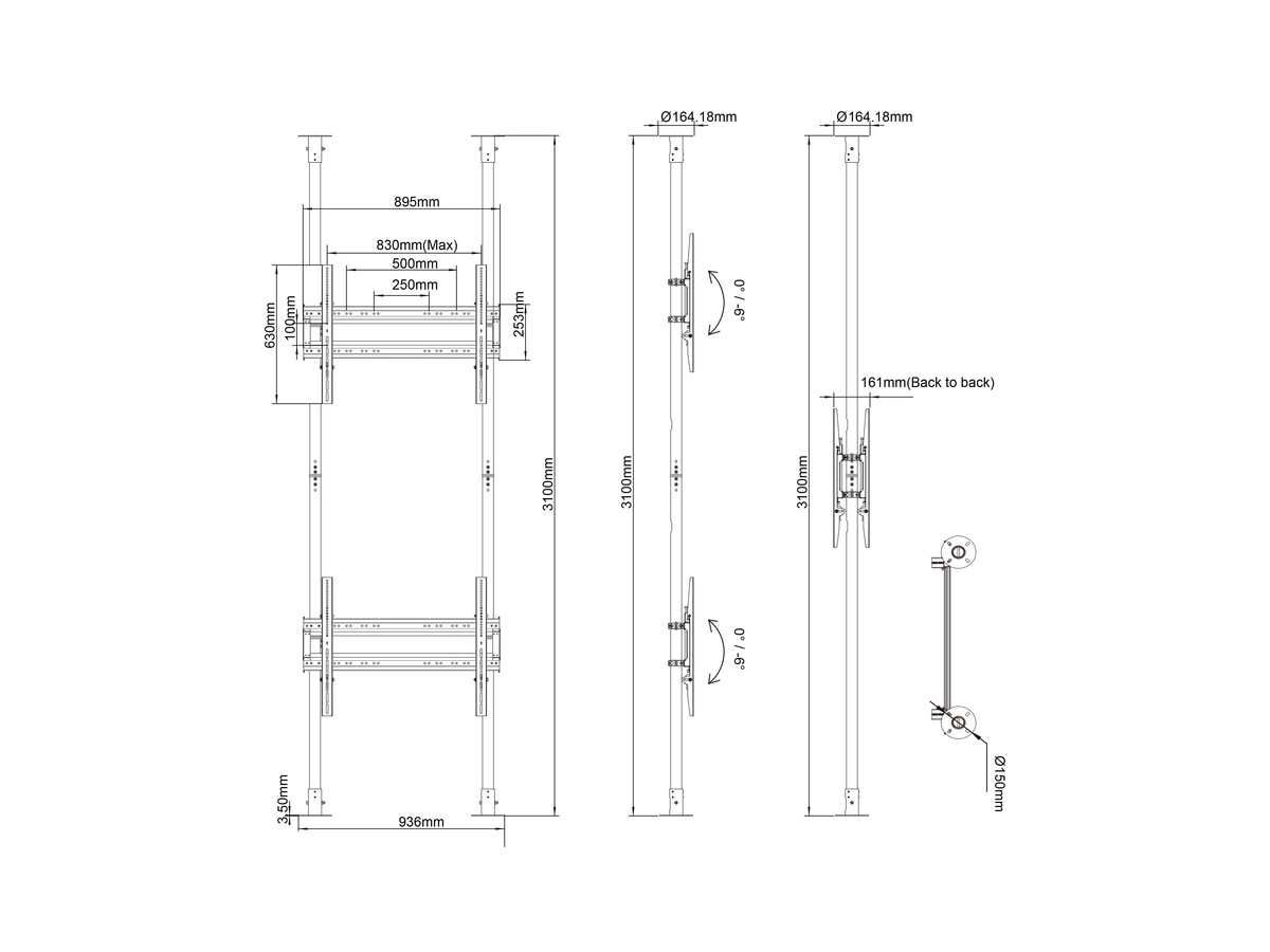 | Pillar length: | Min: 580mm to Max: 1550 mm from ceiling to VESA plate center Extension pipes: 3m (1500mm*2pcs) included |