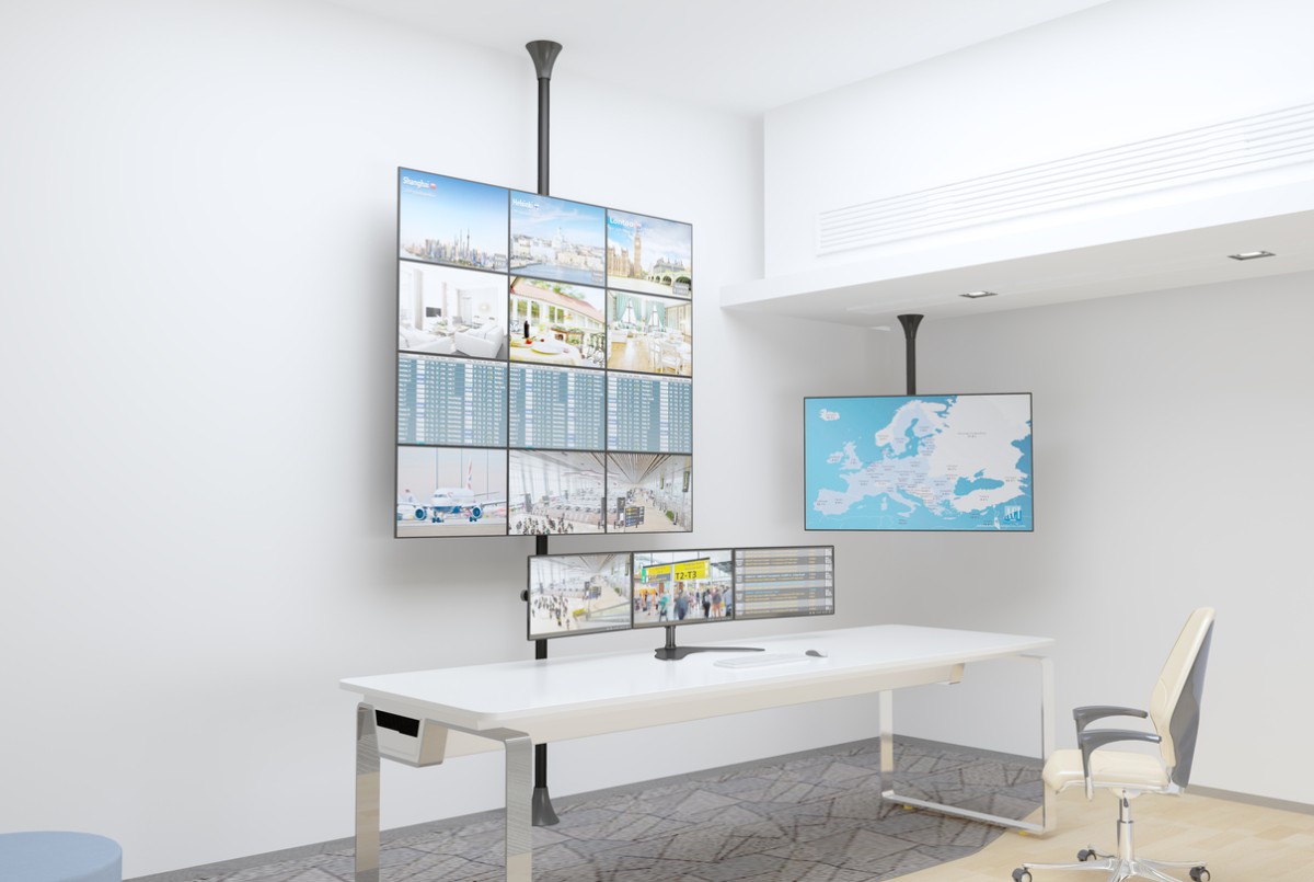 - A modular Floor to ceiling solution that includes simple monitor hook-on feature for multiple displays