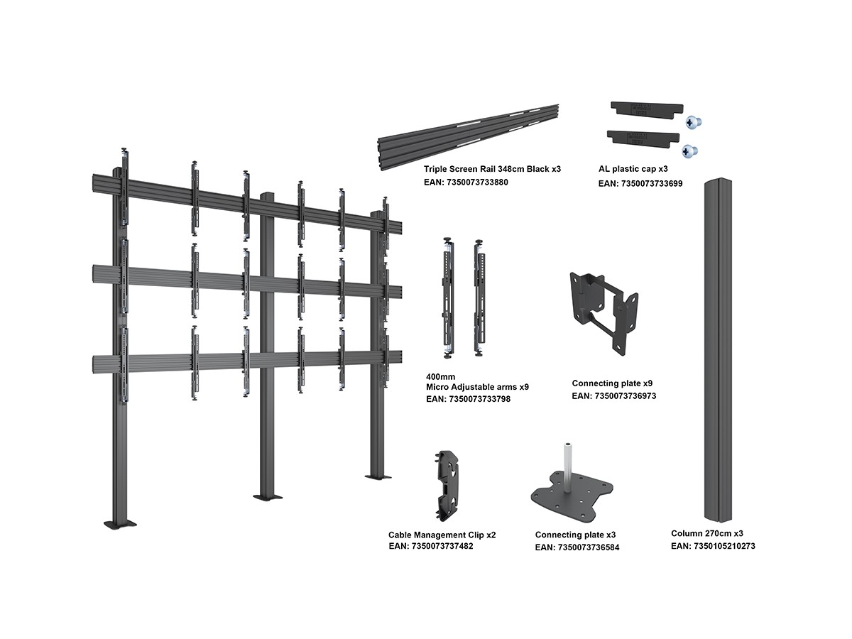 Product code:M Floormount Column Pro 3x3 270 Micro Adjustable - Floor column mount for triple displays, steel, 2.7m height, 3 screens, triple side, micro adjustable arms, VESA Max 600x400 - screen size: 32"-65" - black