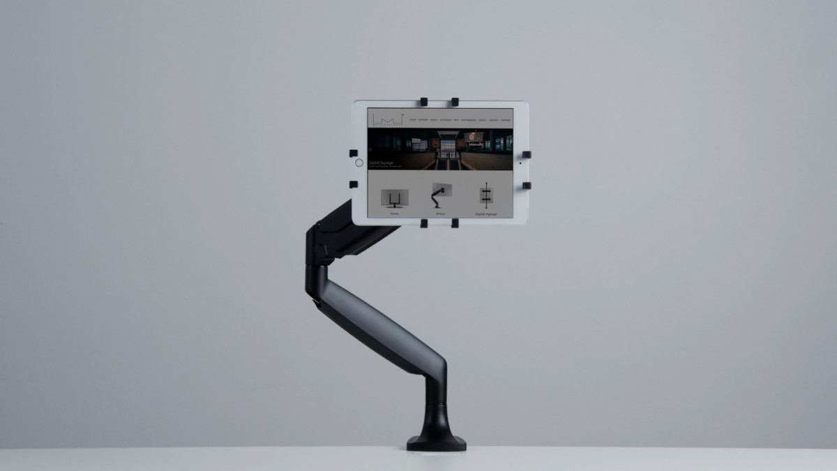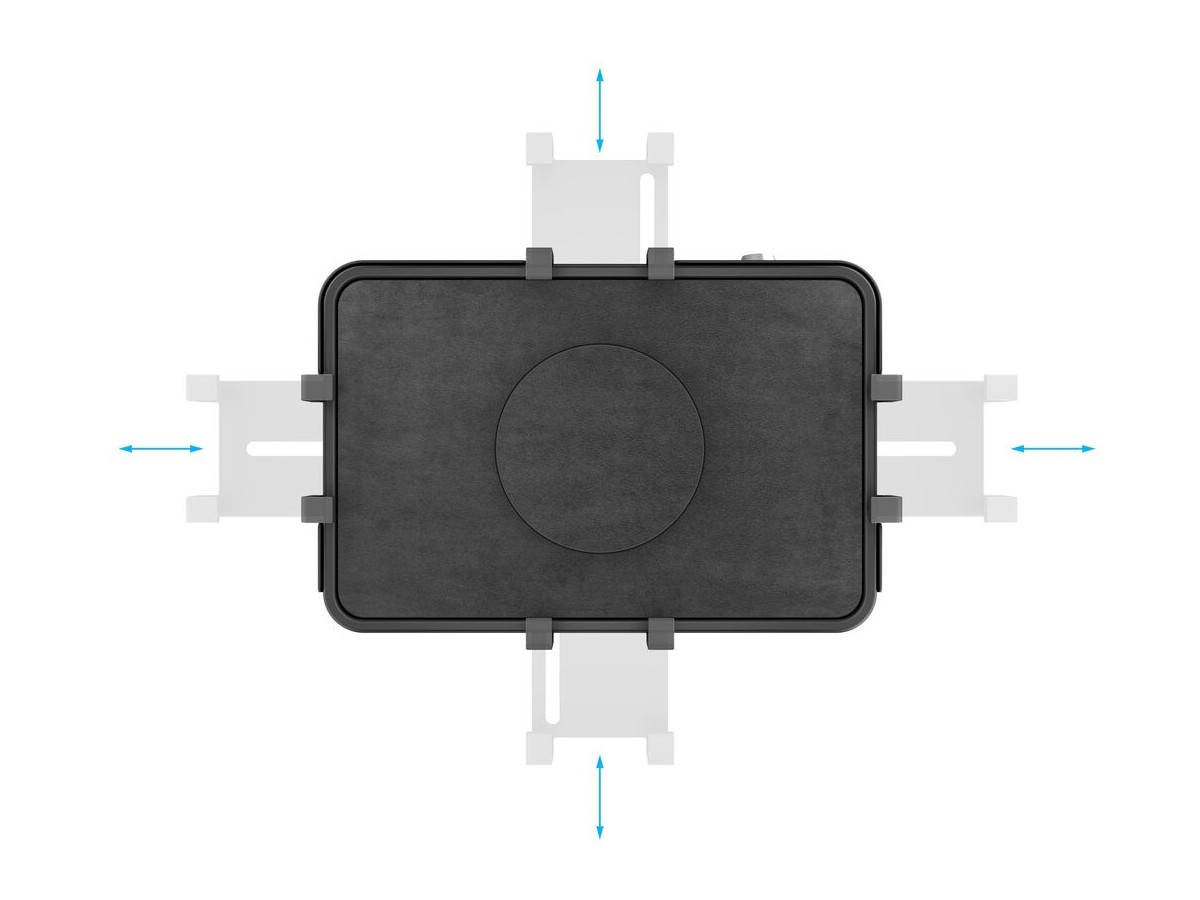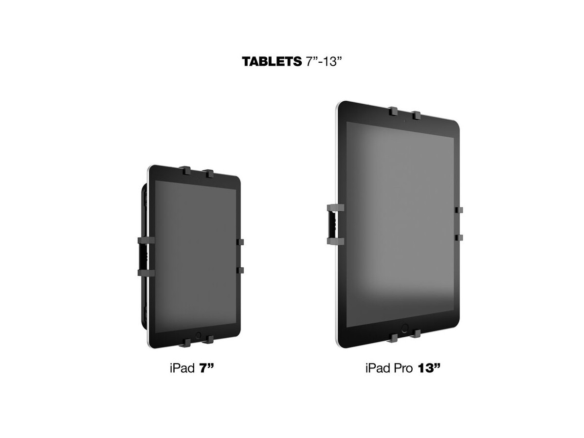 - Sliding arms accept most tablet sizes 7” to 13”, from iPad mini to iPad Pro, with or without case