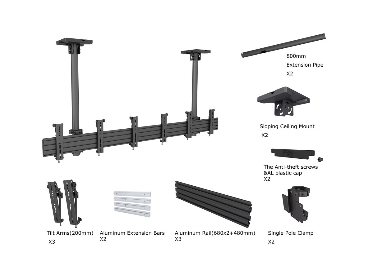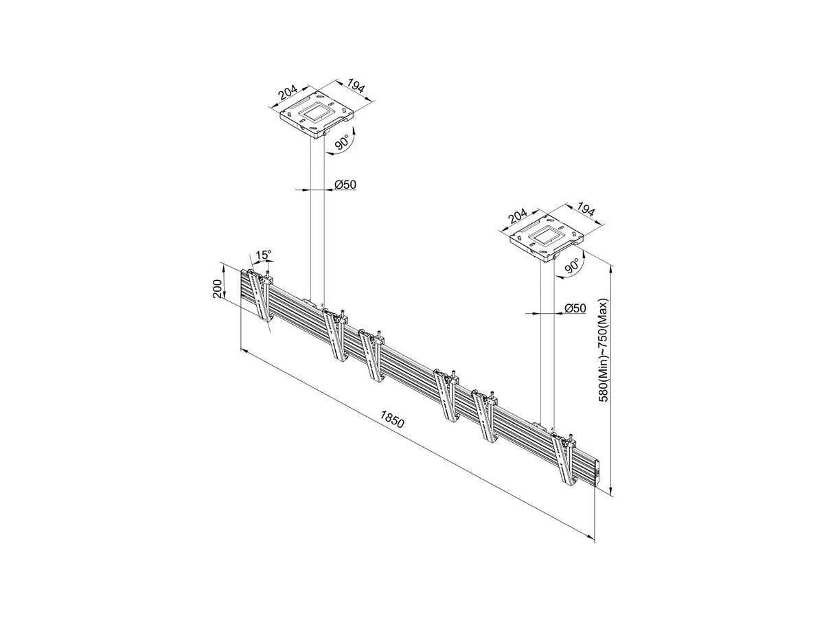 | Pillar length: | 580 mm to 750 mm from ceiling to VESA plate center Extension pipes: 1.5m (800mm*2pcs) included |