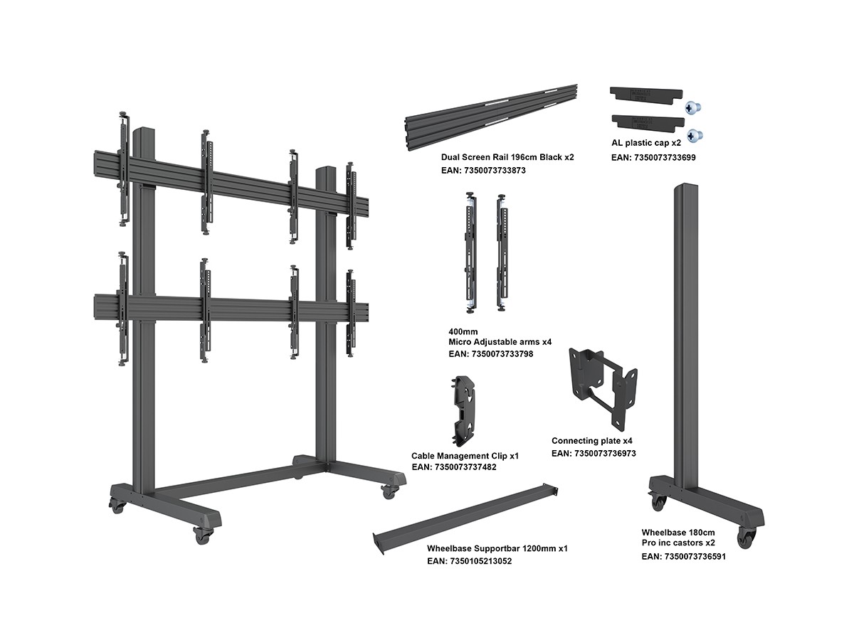Based on 180cm high pillar made out of durable aluminum, the possibilities for height adjustments are very good and it is possible to provide perfect viewing angle for both a sitting and a standing audience. There is a power rail built into each pillar, providing 220v power to the screens or peripheral. This makes installation and cable management an ease. This movable video wall solution creates a solution that can be used for presentations, trade shows, store or office entrances.