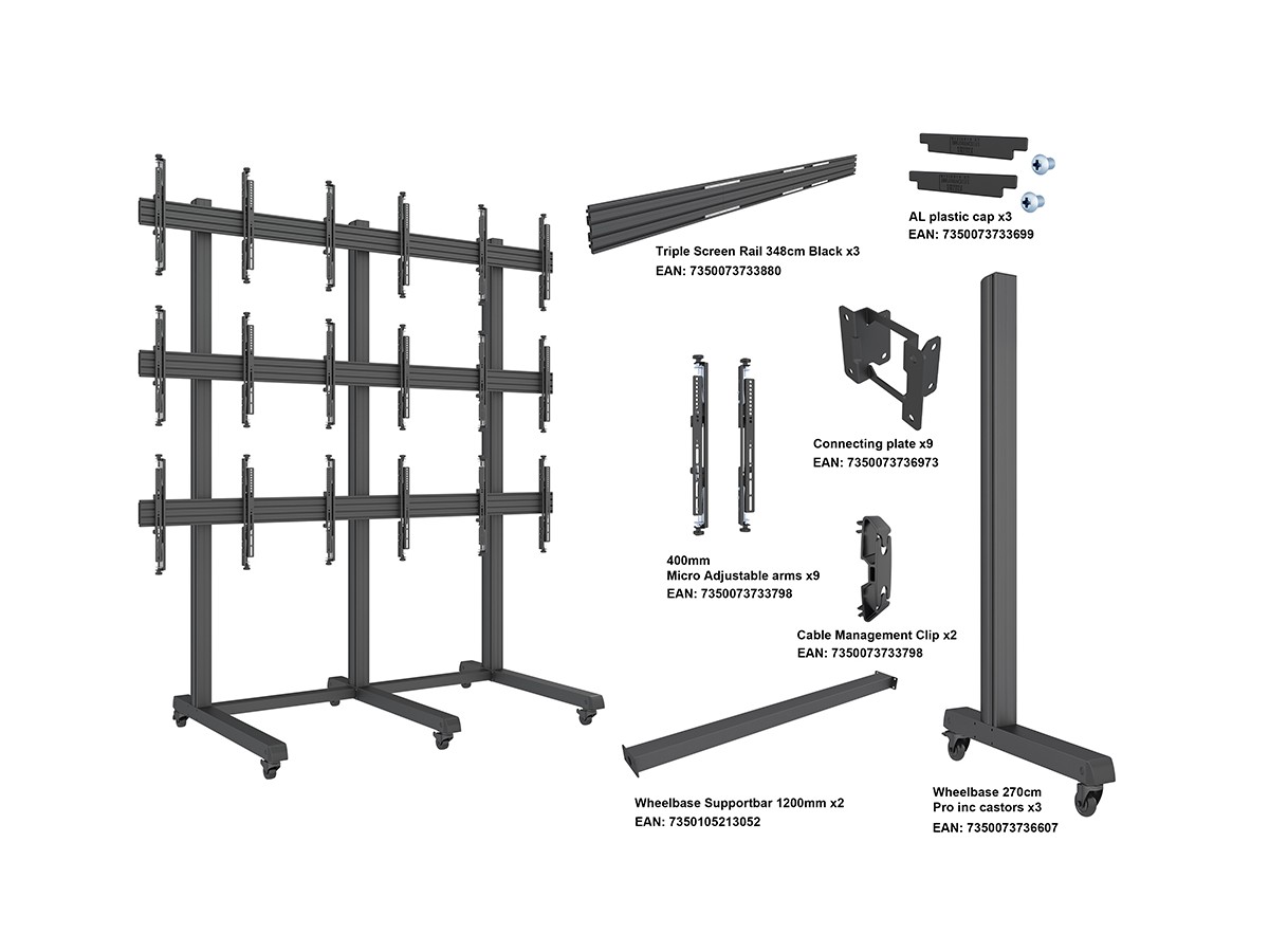 Product code:M Pro Series Video Wall Stand 3x3 43-65" Black - Stand for 3x3 displays - aluminum - black - screen size: 43" - 65" - mounting interface: 600 x 400 mm - floor-standing - wheelbased