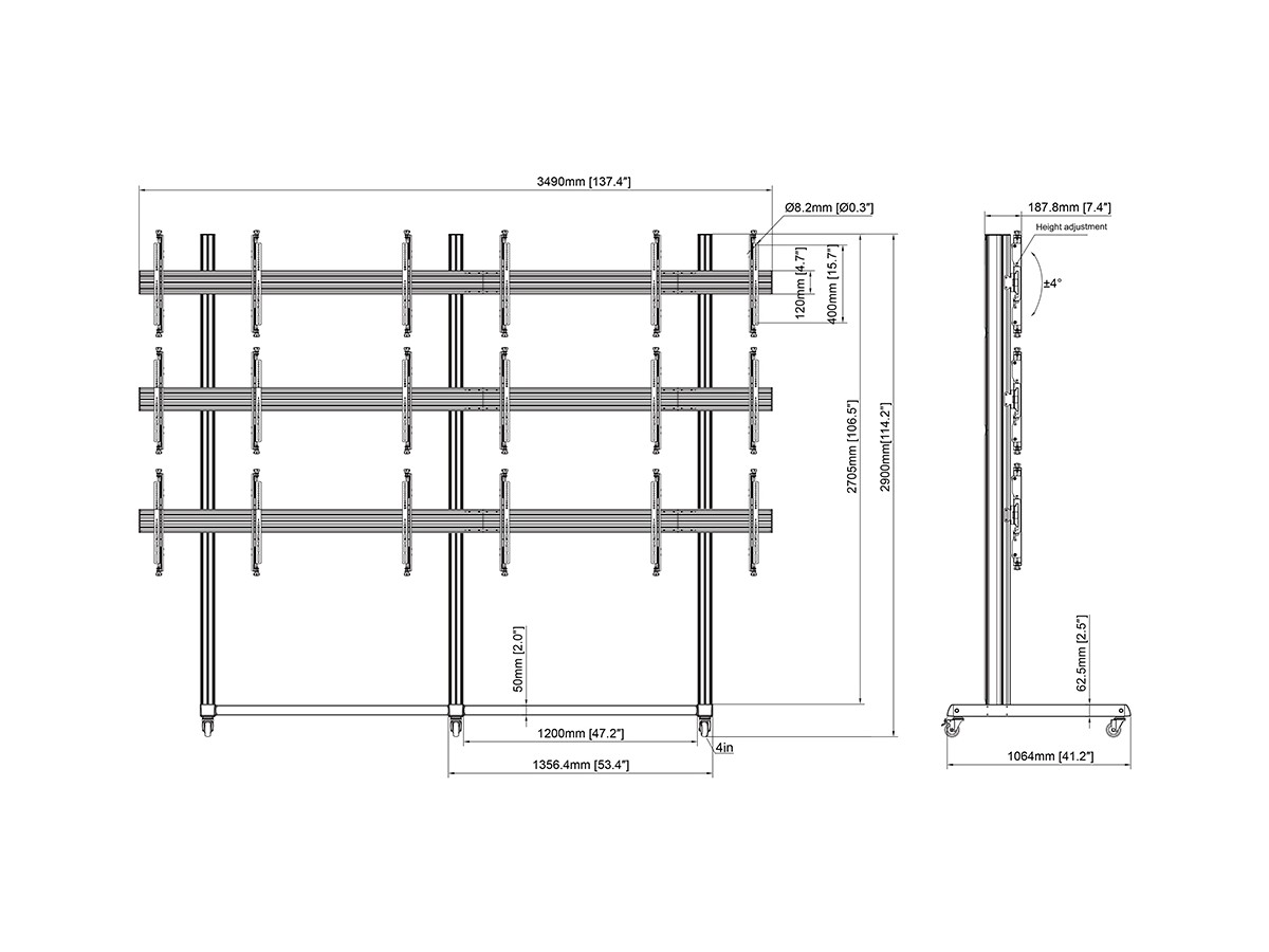 M Pro Series Video Wall Stand screen array configuration can accomodate 3 pcs 43-65" screens wide x 3 screens high.