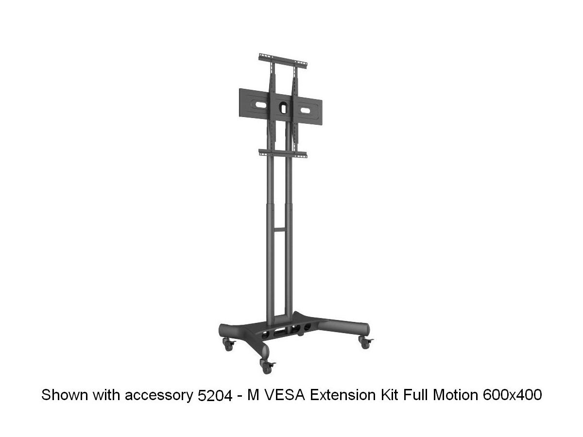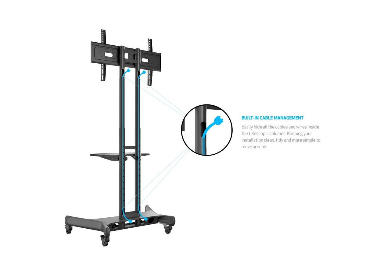 Easy screen height- adjustment, and mobility mean that an optimal viewing position can always be achieved for any presentation, digital -signage or video-conference situation. The heavy -duty wheels feature a safety- brake, ensuring the Stand cannot roll out of position, whilst the Integrated cable- management system ensures a tidy and professional look.