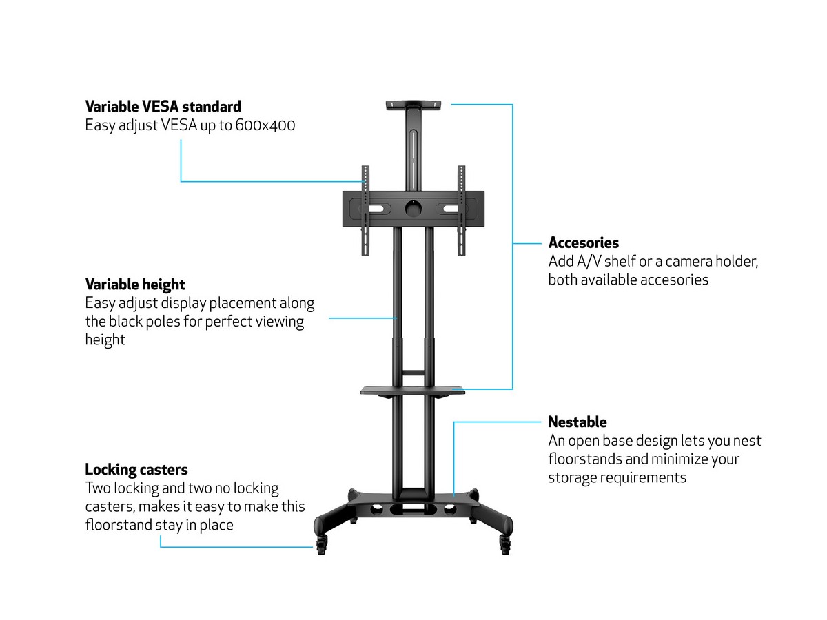 Perfect for use in education; classrooms, lecture theatres, or in commercial environments, Floorstand Basic features a large and stable base with four robust wheels . You can now move your valuable display safely and easily from room to room with smooth passage through doorways and over thresholds.