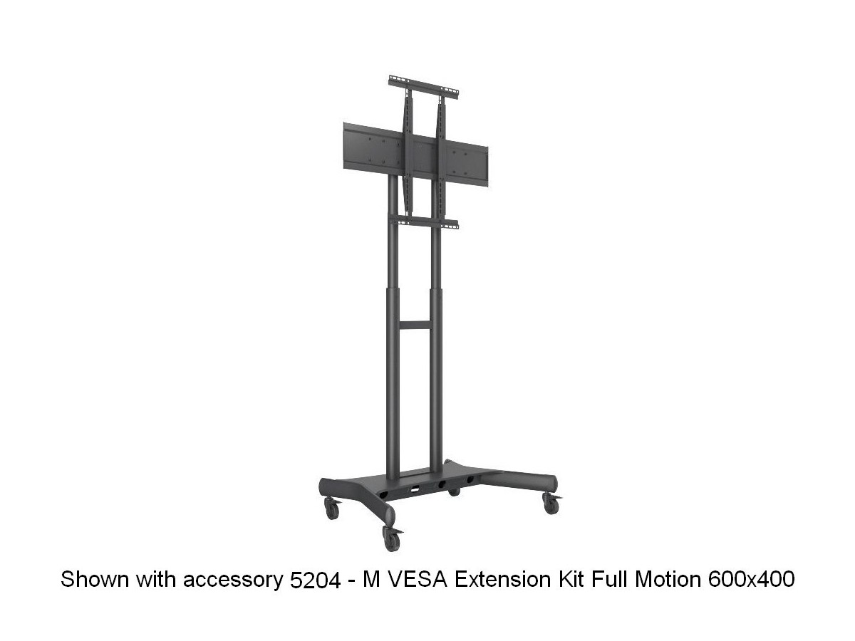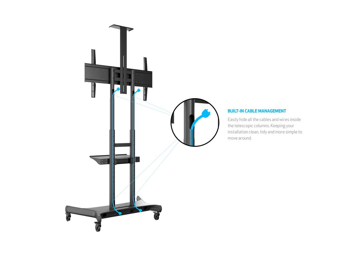 Easy screen height- adjustment, and mobility mean that an optimal viewing position can always be achieved for any presentation, digital -signage or video-conference situation. The heavy -duty wheels feature a safety- brake, ensuring the Stand cannot roll out of position, whilst the Integrated cable- management system ensures a tidy and professional look.