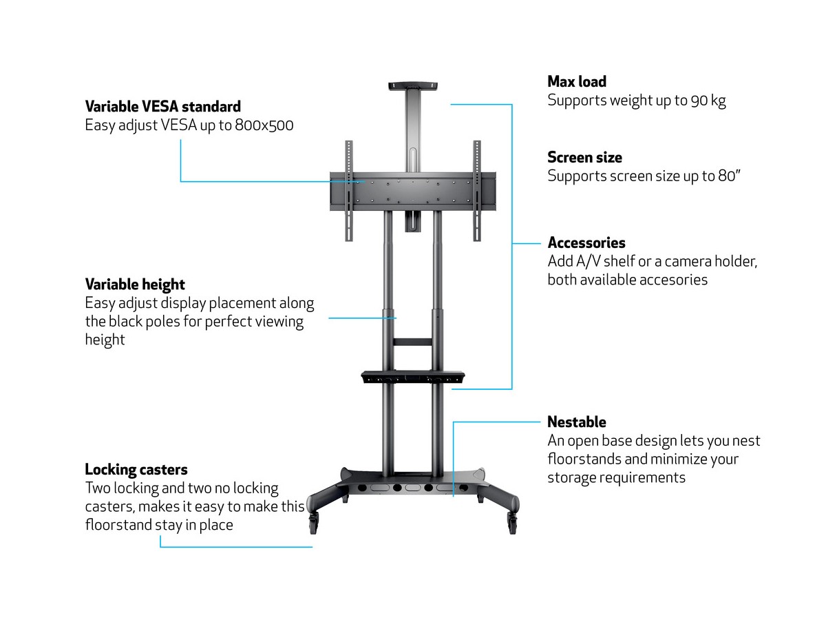 Perfect for use in education; classrooms, lecture theatres, or in commercial environments, Floorstand Basic features a large and stable base with four robust wheels . You can now move your valuable display safely and easily from room to room with smooth passage through doorways and over thresholds.