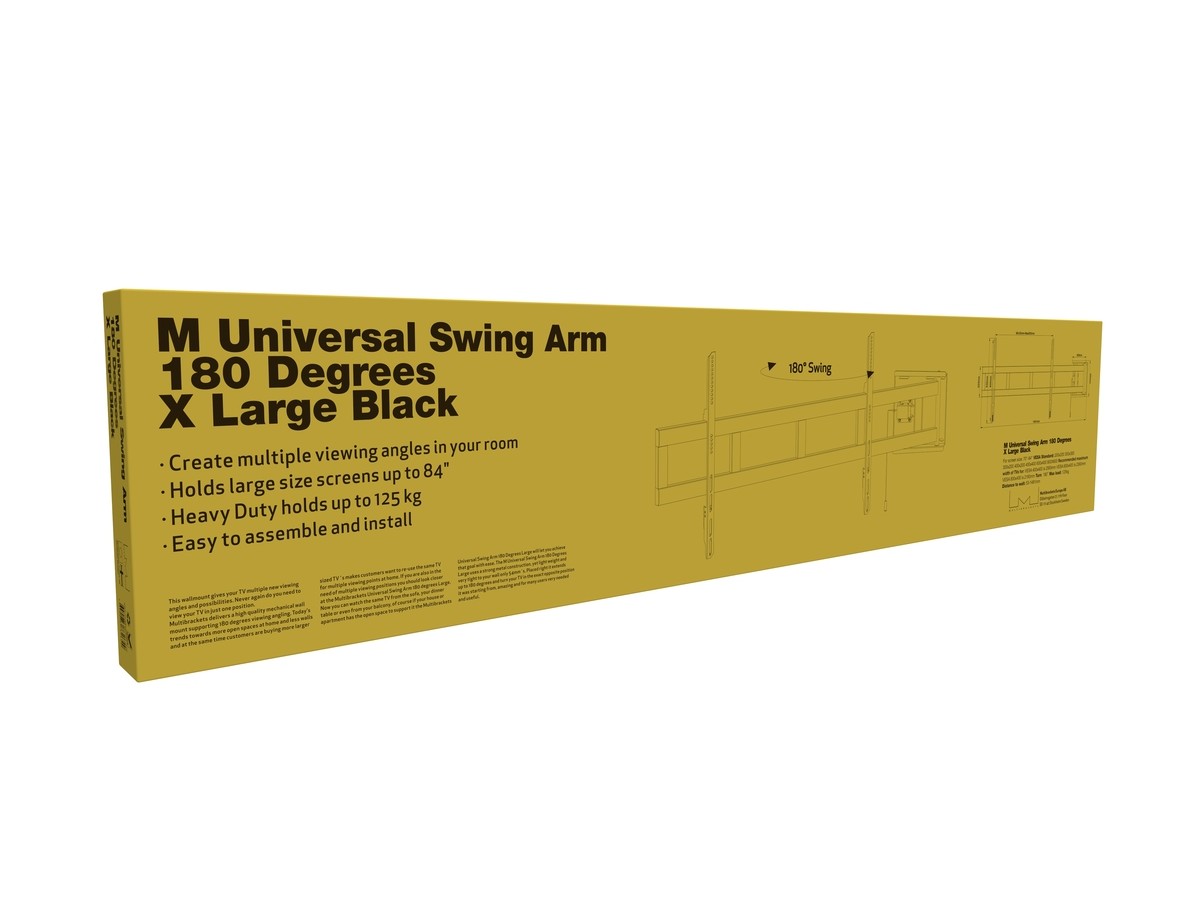 The M Universal Swing Arm 180 Degrees X Large uses a strong metal construction, yet light weight and very tight to your wall only 54mm´s. Placed right it extends up to 180 degrees and turn your TV in the exact opposite position it was starting from, amazing and for many users very needed and useful.