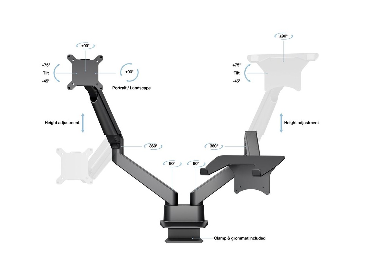 - Create ergonomic viewing angles for sitting or standing position, landscape or portrait mode.