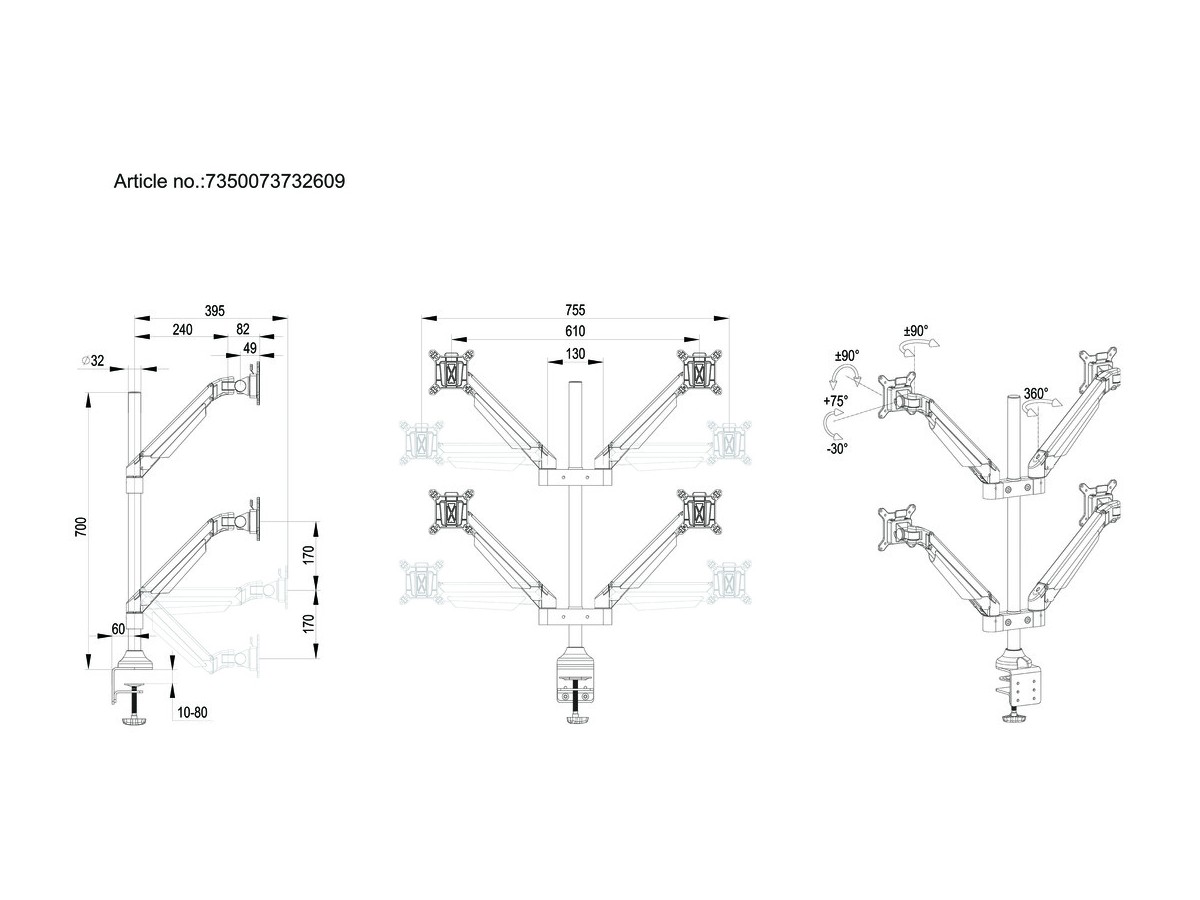 Product code:Multibrackets M VESA Gas Lift Arm Quad HD - Mounting kit ( desk clamp mount, 4 articulating arms ) for 4 LCD displays - aluminum - black - screen size: 15" - 32" - mounting interface: 100 x 100 mm, 75 x 75 mm